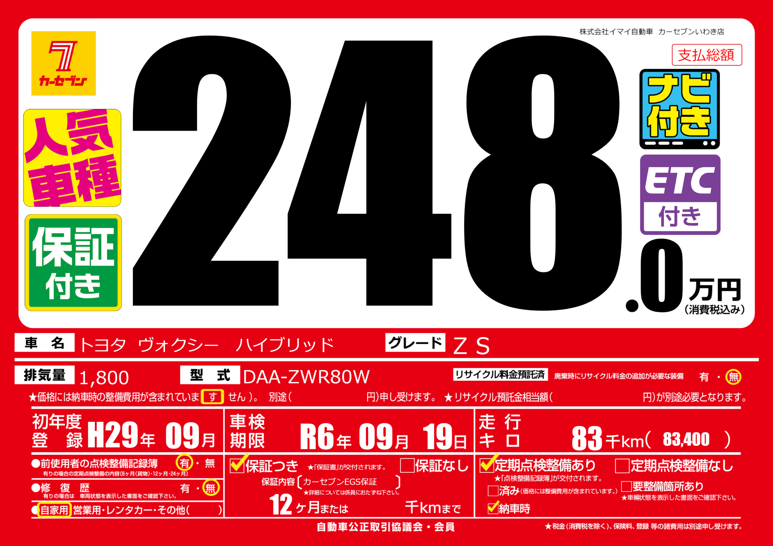 | 車名 | トヨタ ヴォクシー ハイブリッド | グレード ミッション 排気量 |
