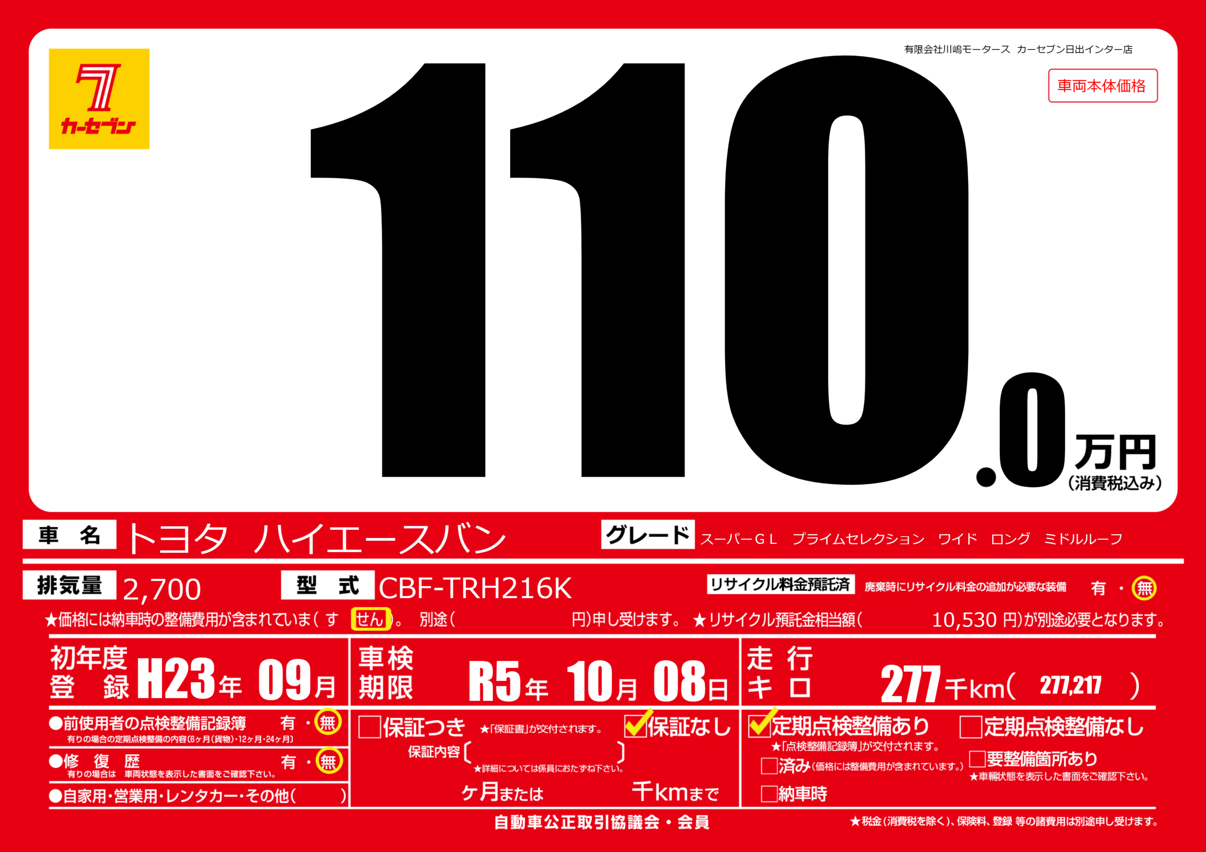 | 車名 | トヨタ ハイエースバン | グレード ミッション 排気量 |