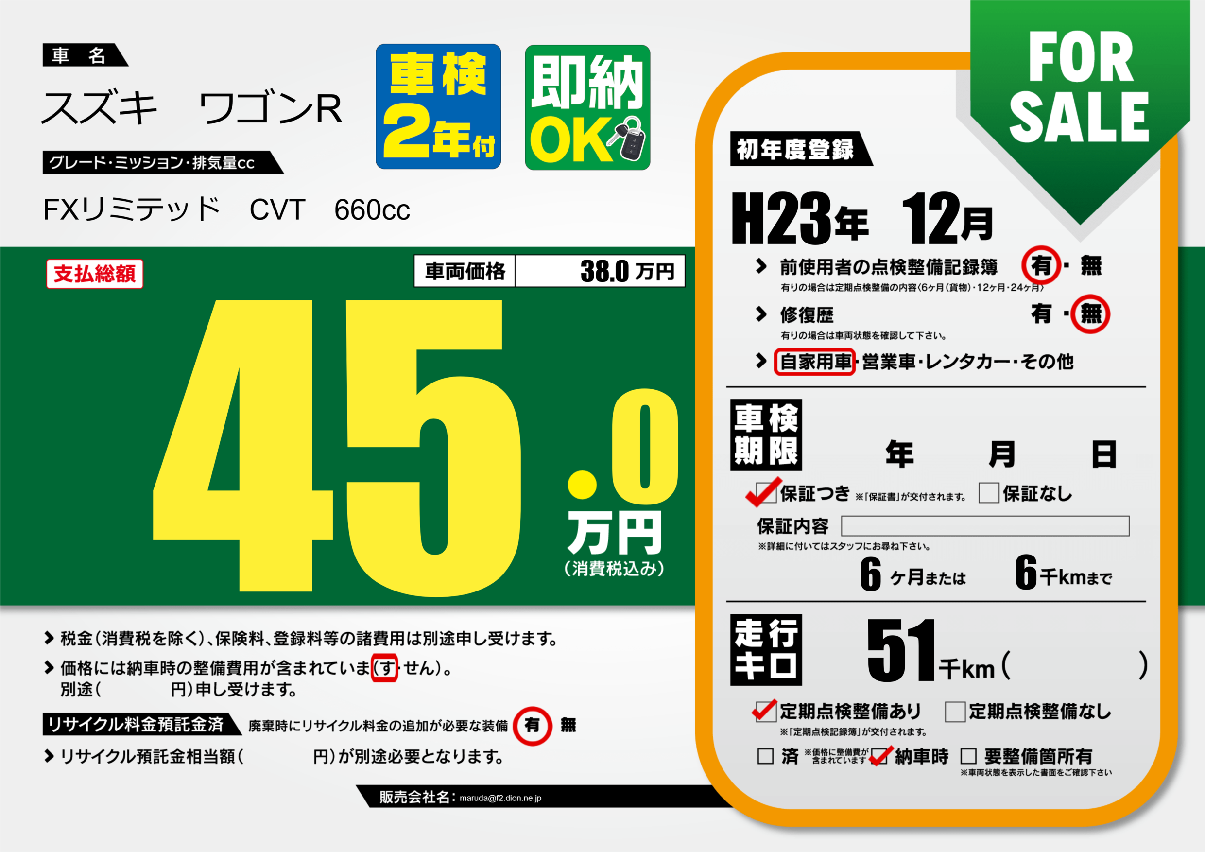 | 走行キロ | 5.1万km | 初年度登録 | H23年12月 |