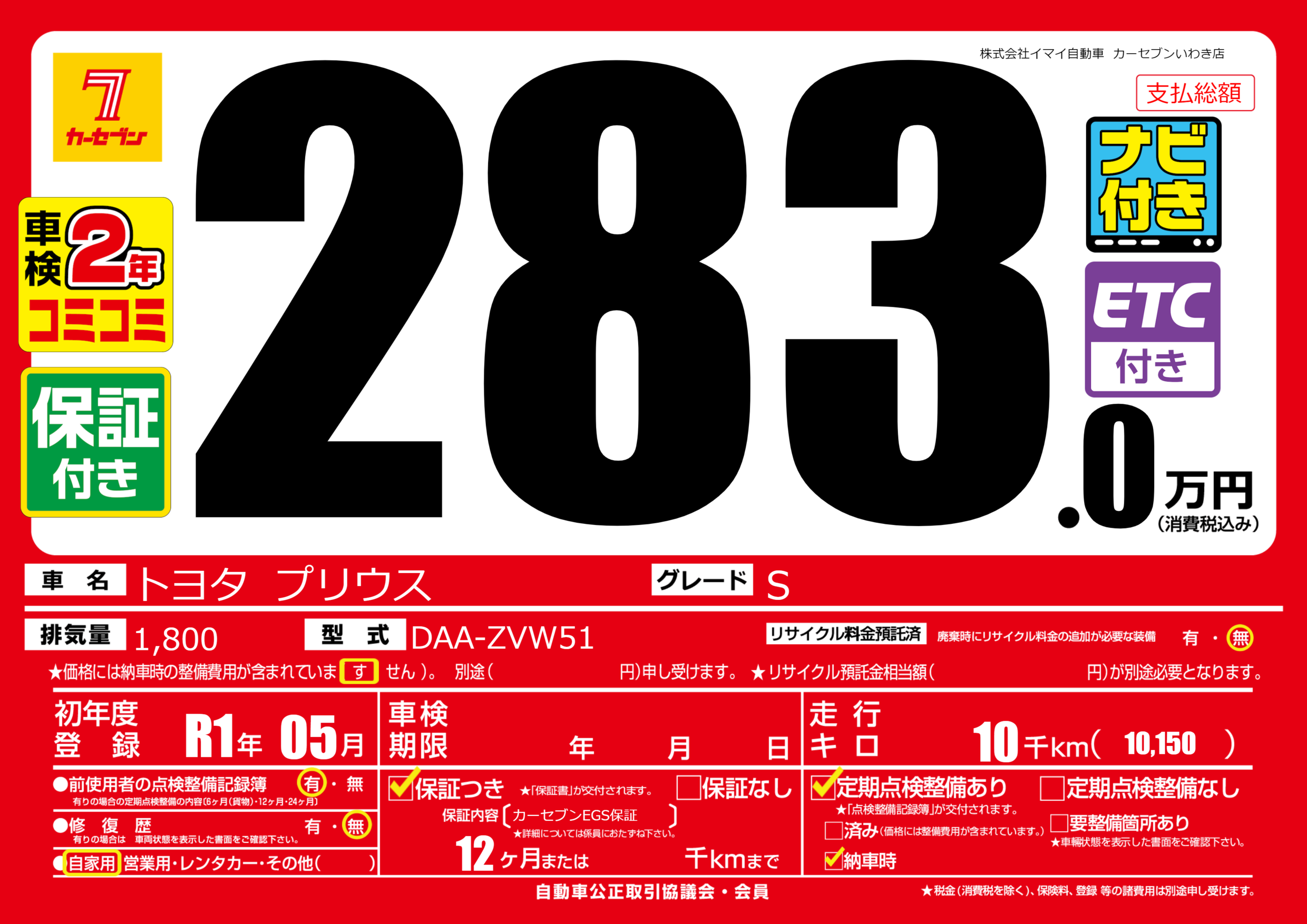 | 車名 | トヨタ プリウス | グレード ミッション 排気量 |
