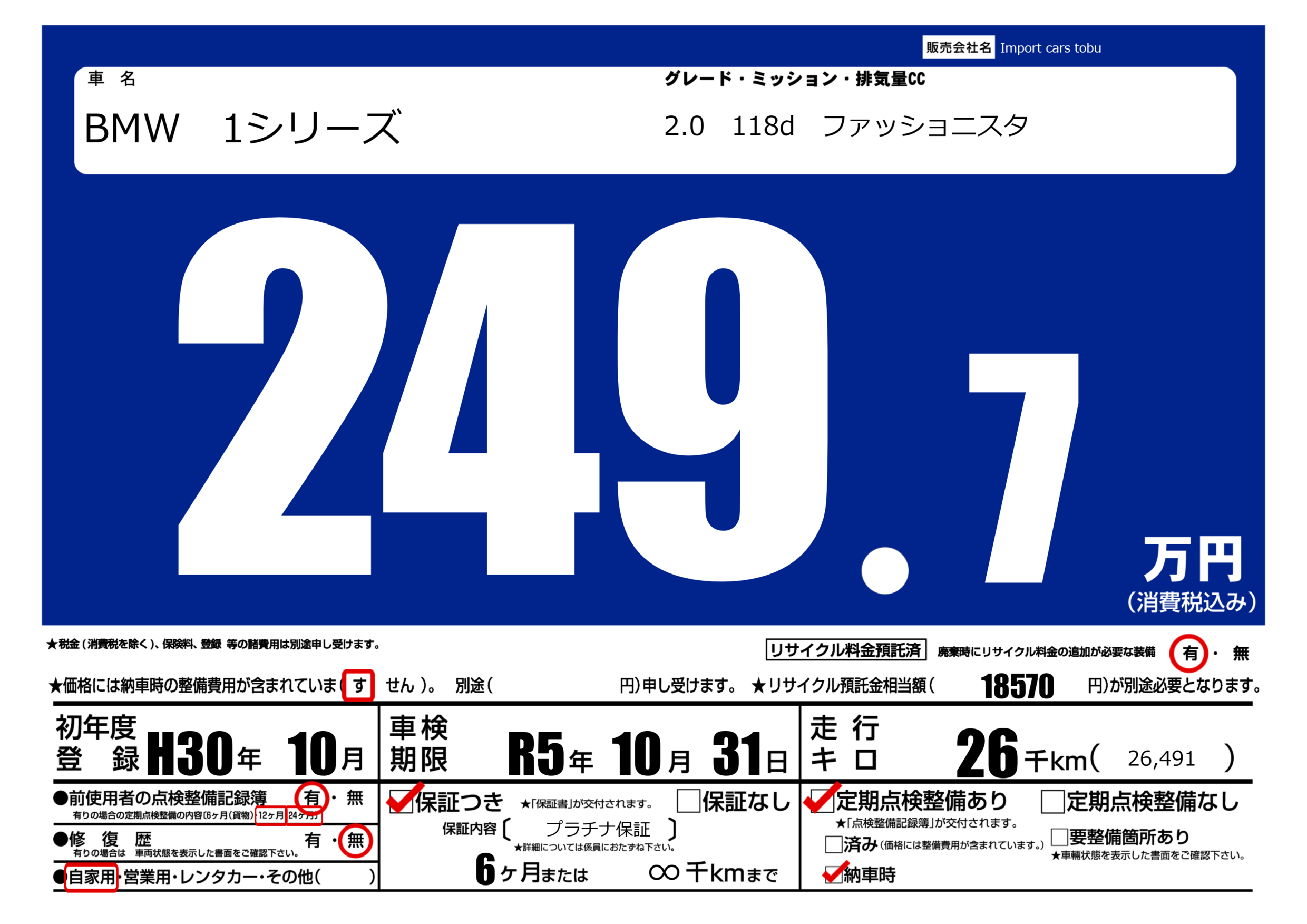 保証付き 保証内容( プラチナ保証) 6ヶ月または(∞)千kmまで |