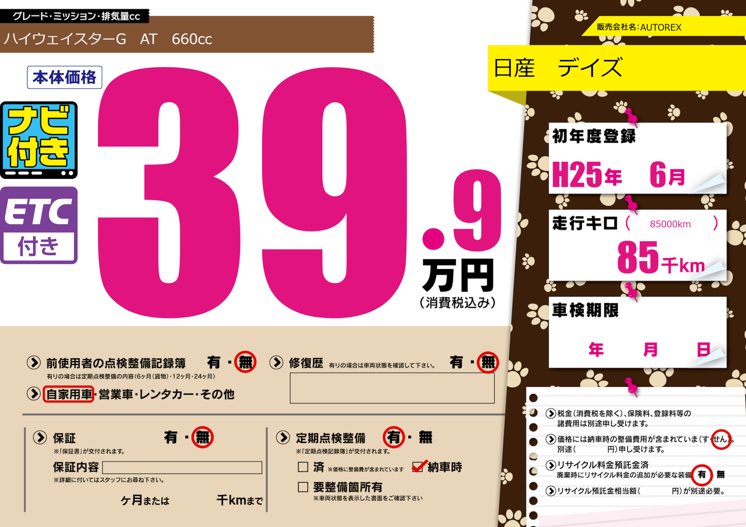 | 車名 | 日産 デイズ | グレード ミッション 排気量 |