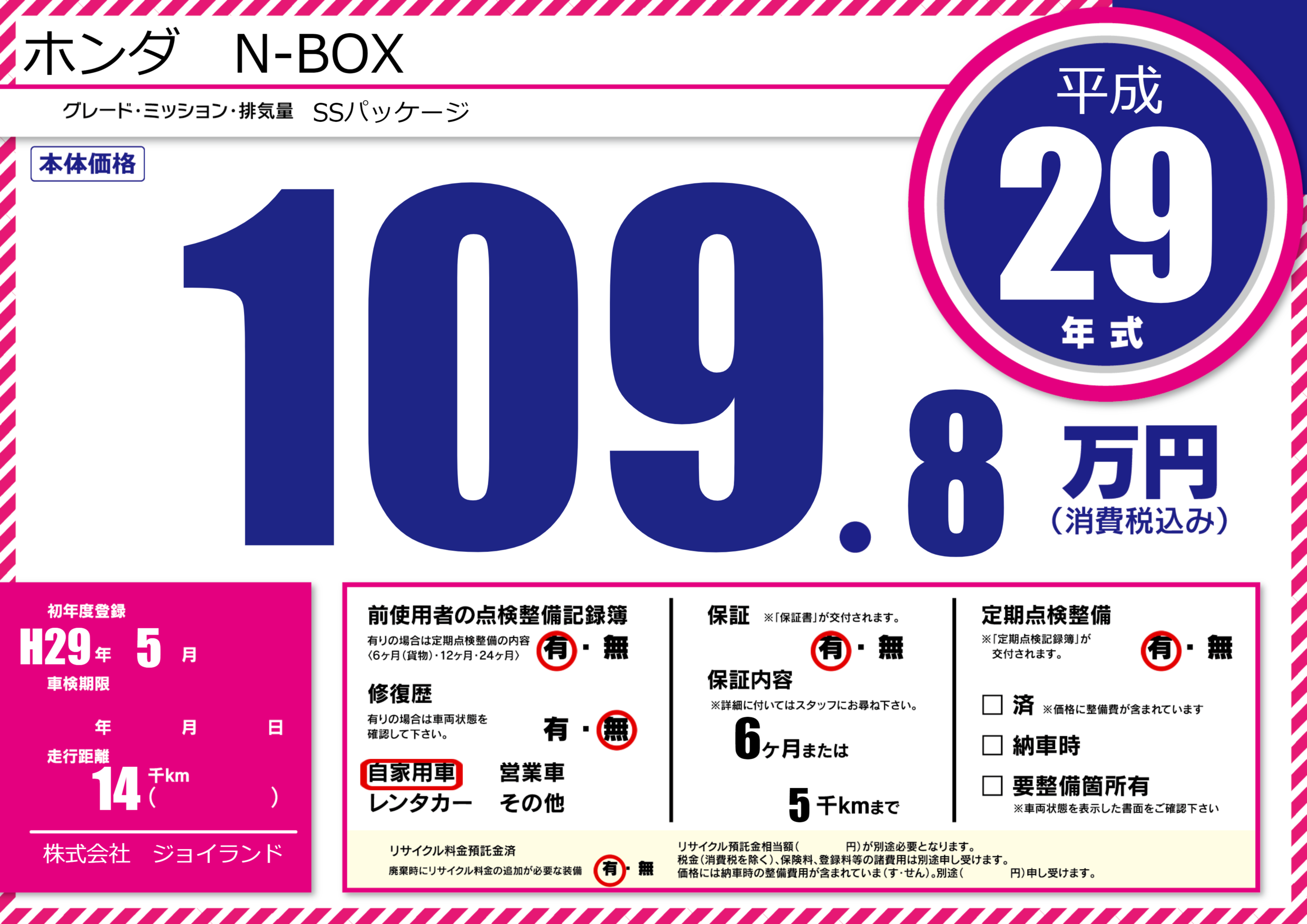 | 車名 | ホンダ N-BOX | グレード ミッション 排気量 |