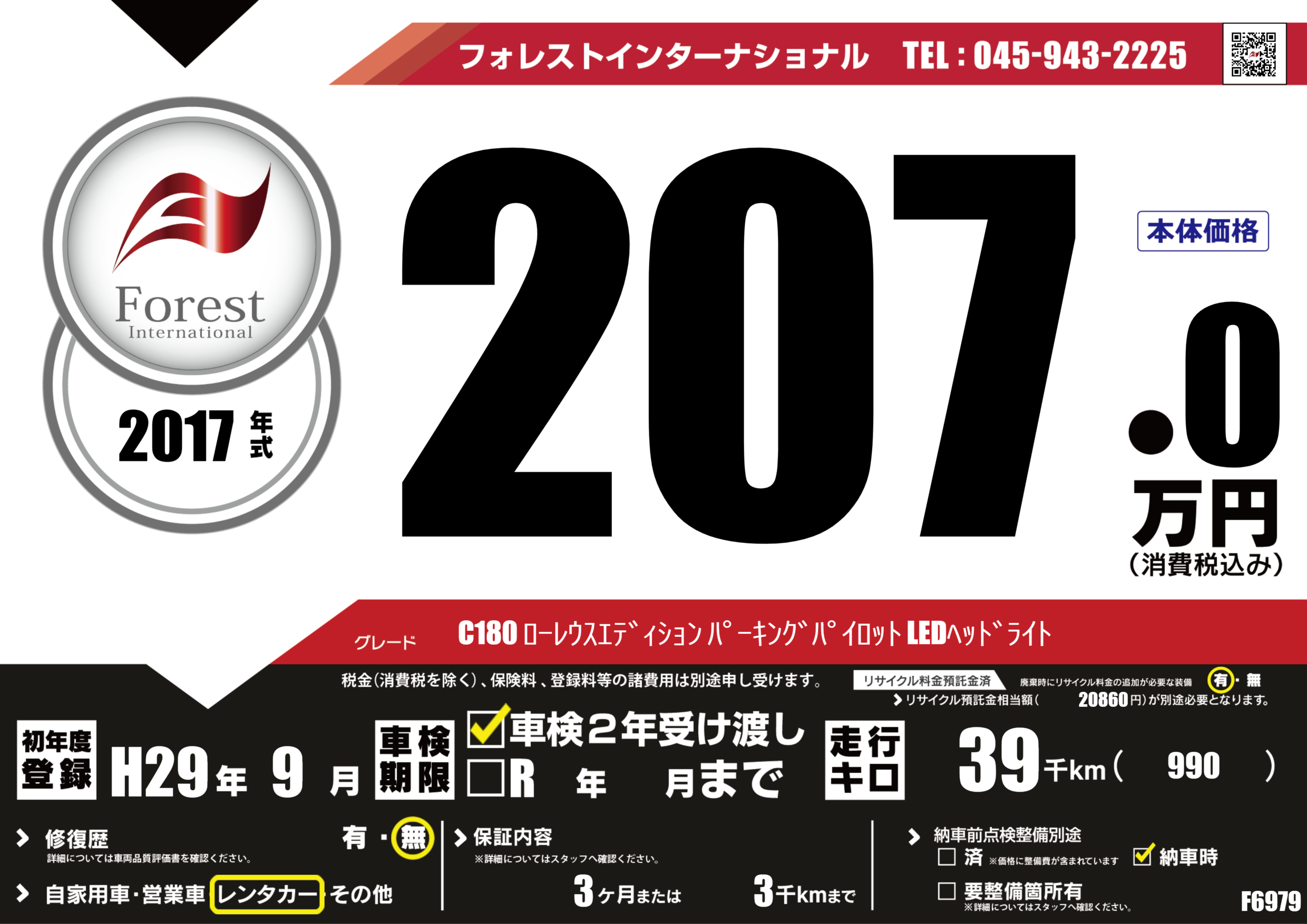 | 走行キロ | 3.9万km | 初年度登録 | H29年9月 |