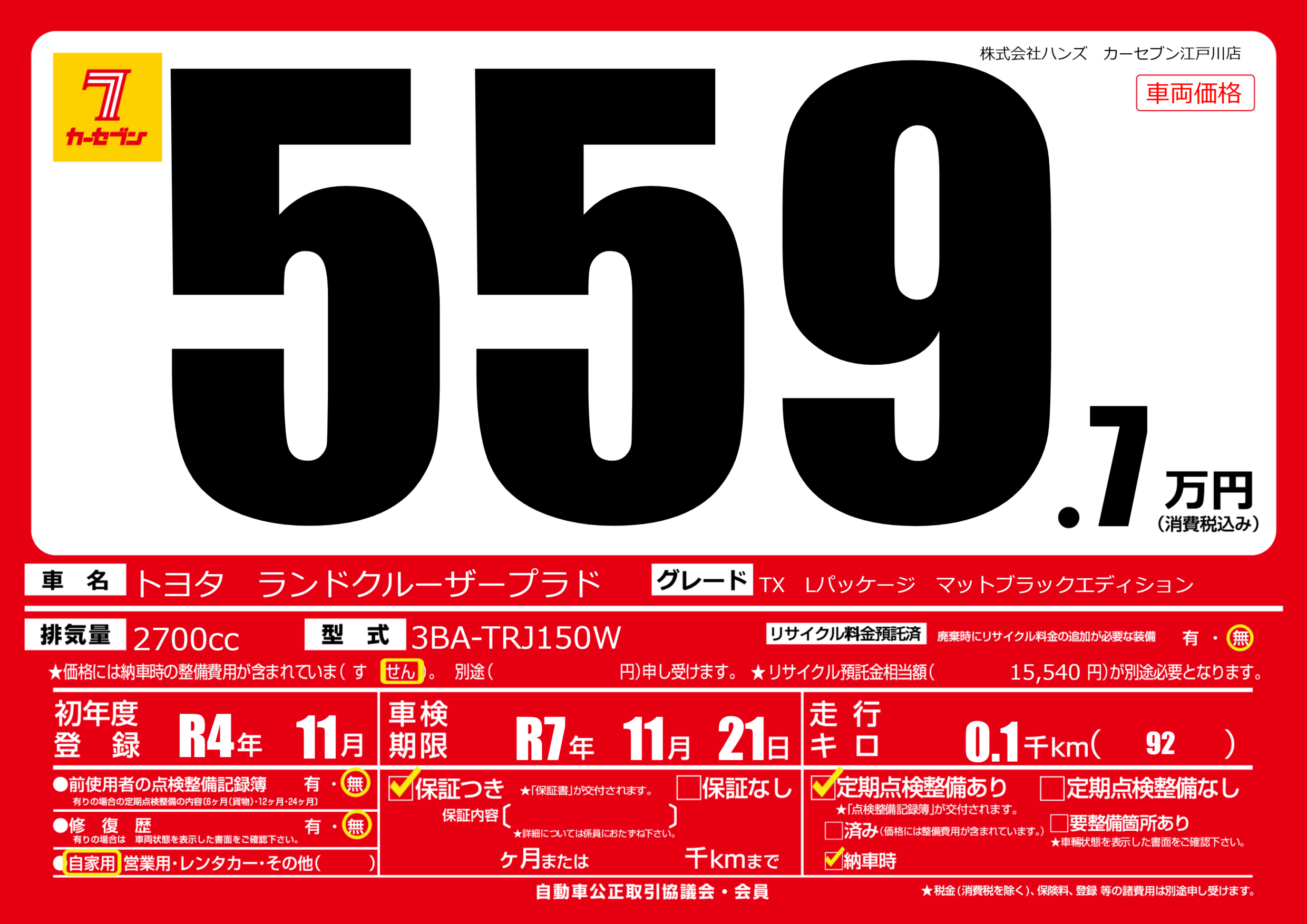 | 車名 | トヨタ ランドクルーザープラド | グレード ミッション 排気量 |