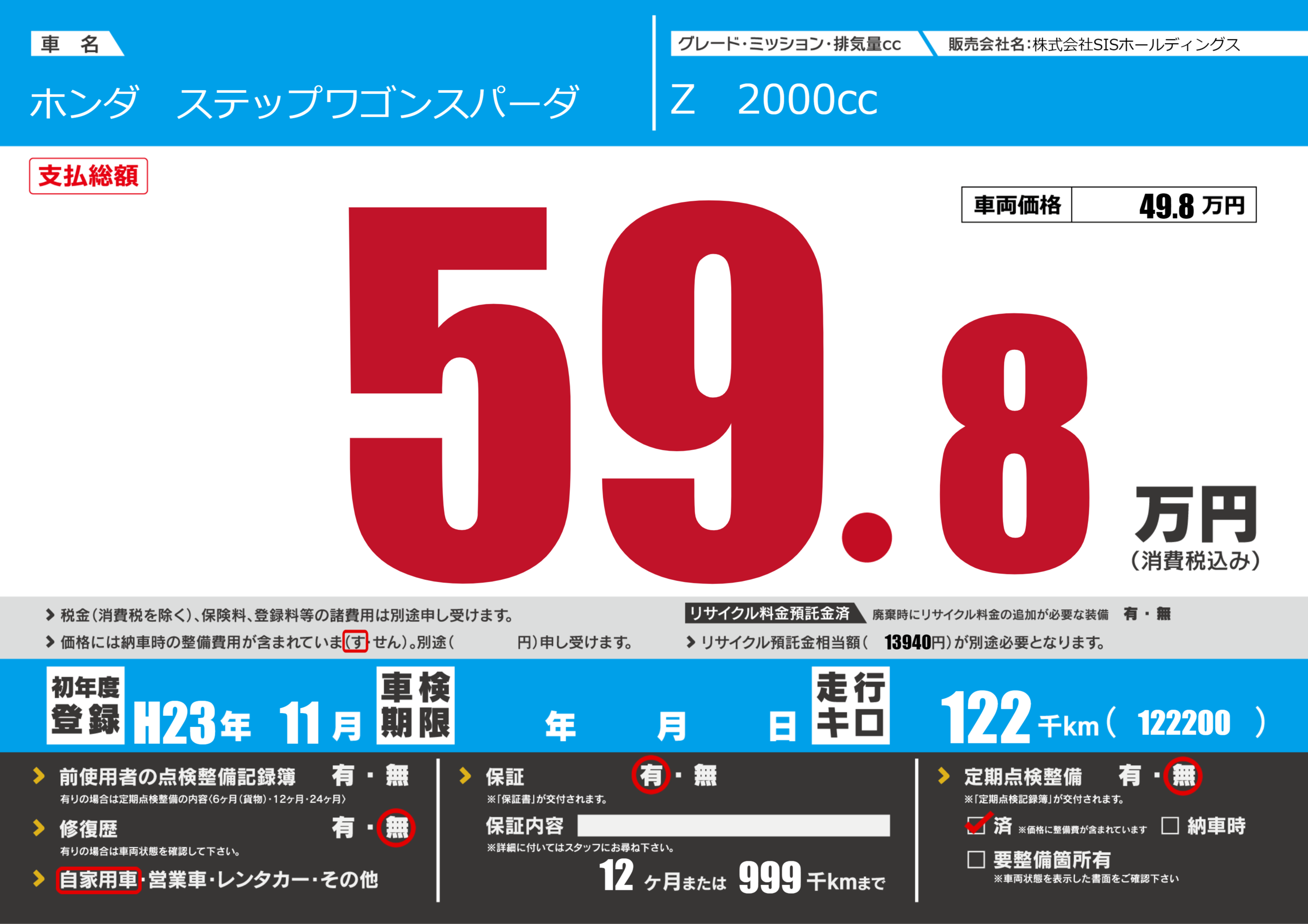 | 走行キロ | 12.2万km | 初年度登録 | H23年11月 |