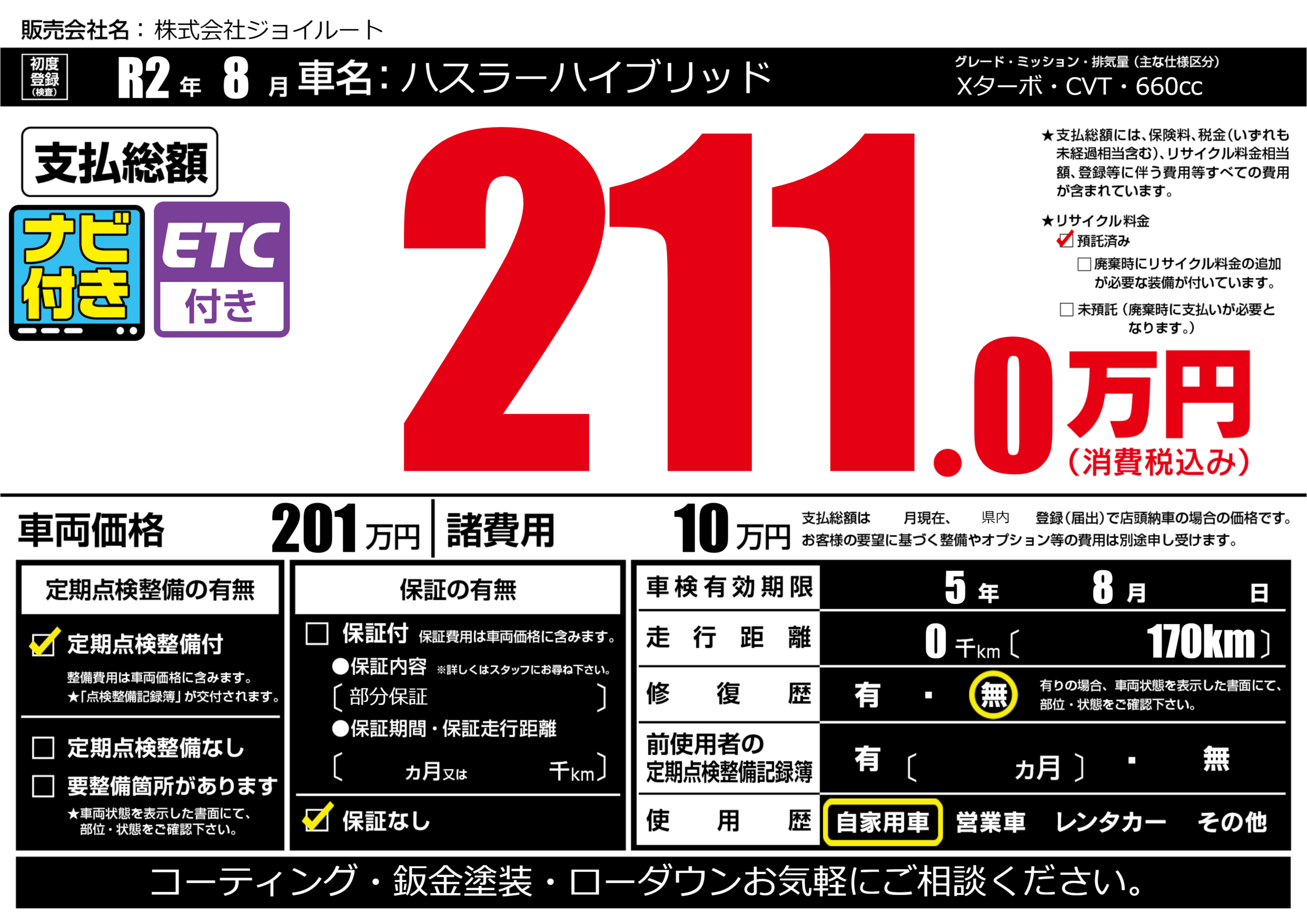 | 走行キロ | - | 初年度登録 | R2年8月 |