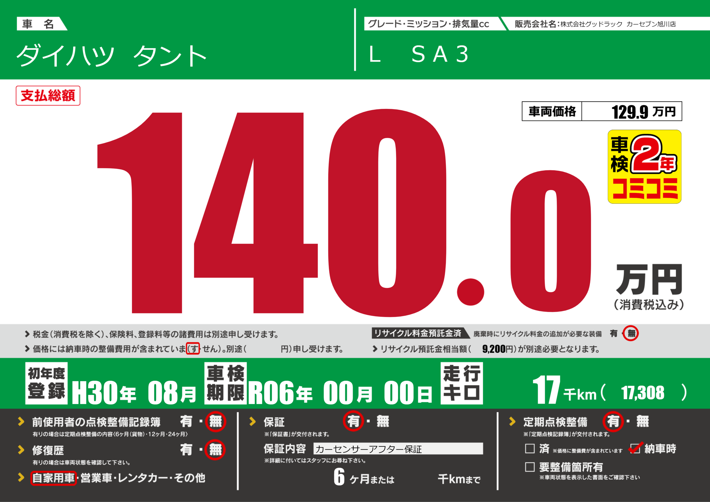 | 車名 | ダイハツ タント | グレード ミッション 排気量 |