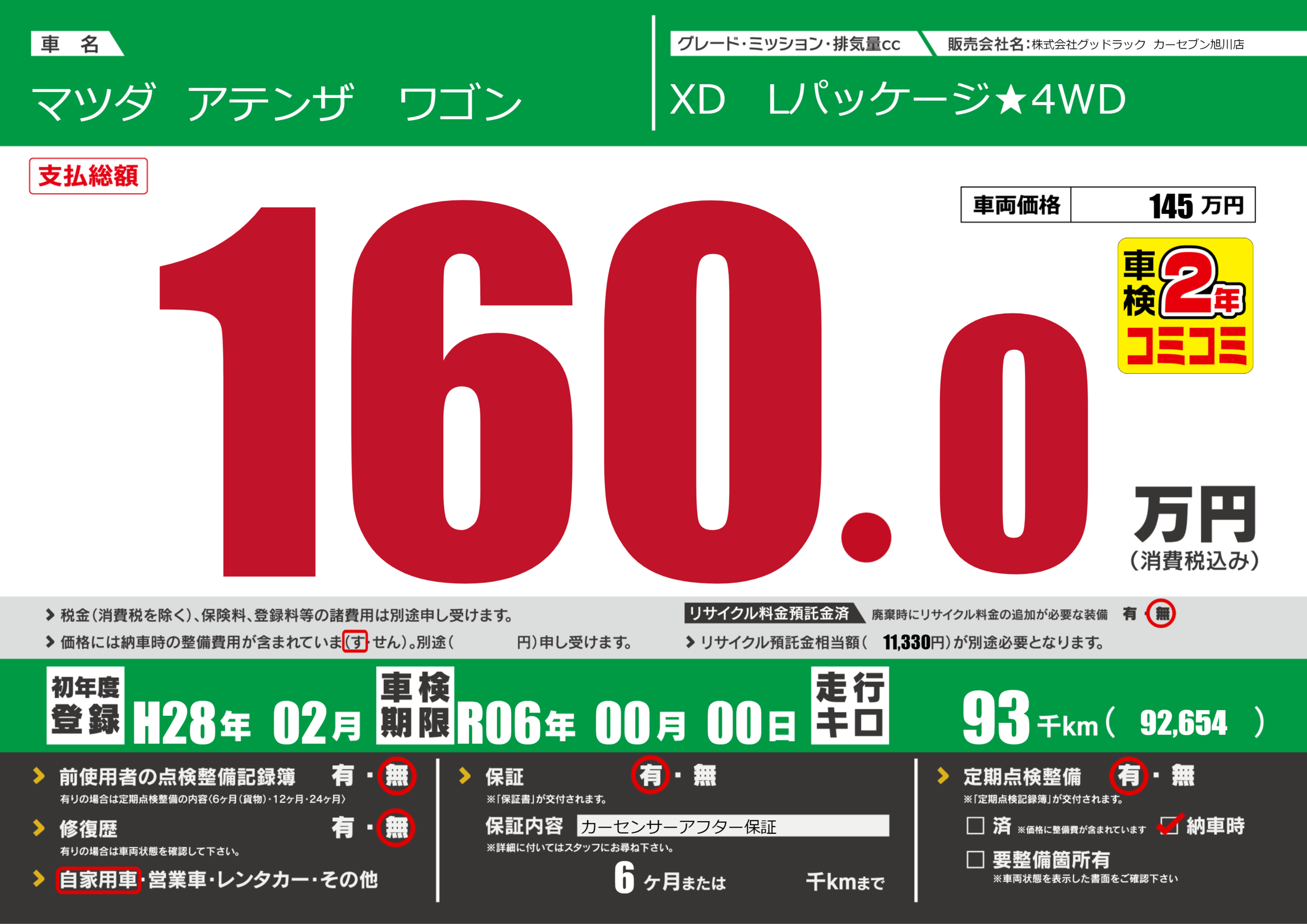 | 走行キロ | 9.3万km | 初年度登録 | H28年02月 |