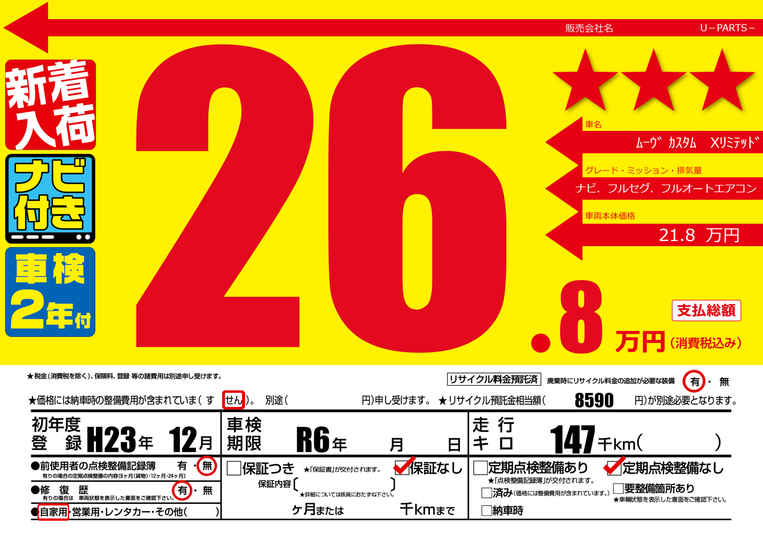 | 走行キロ | 14.7万km | 初年度登録 | H23年12月 |
