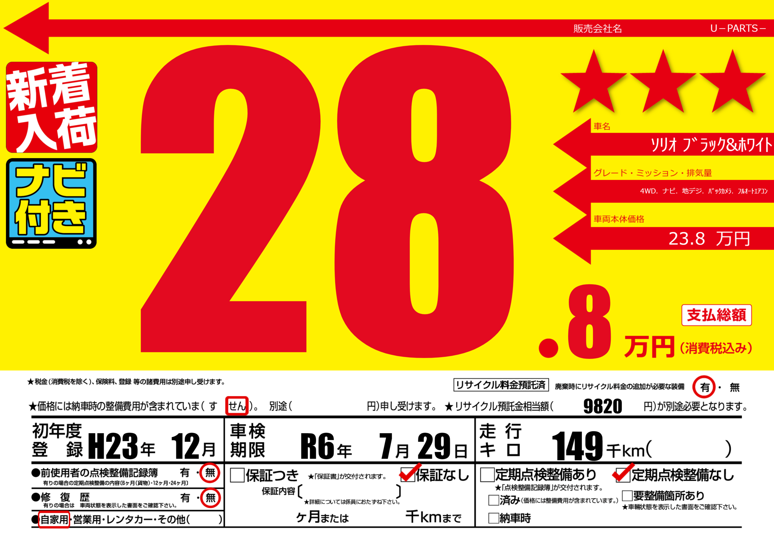 | 走行キロ | 14.9万km | 初年度登録 | H23年12月 |