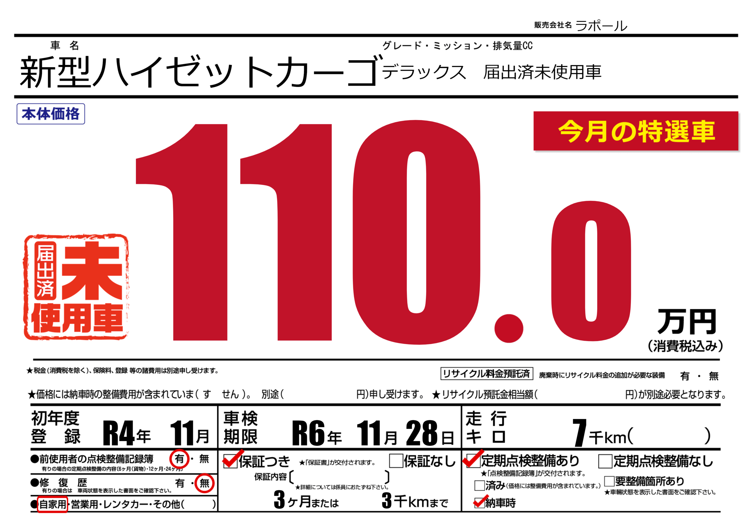 | 走行キロ | 0.7万km | 初年度登録 | R4年11月 |