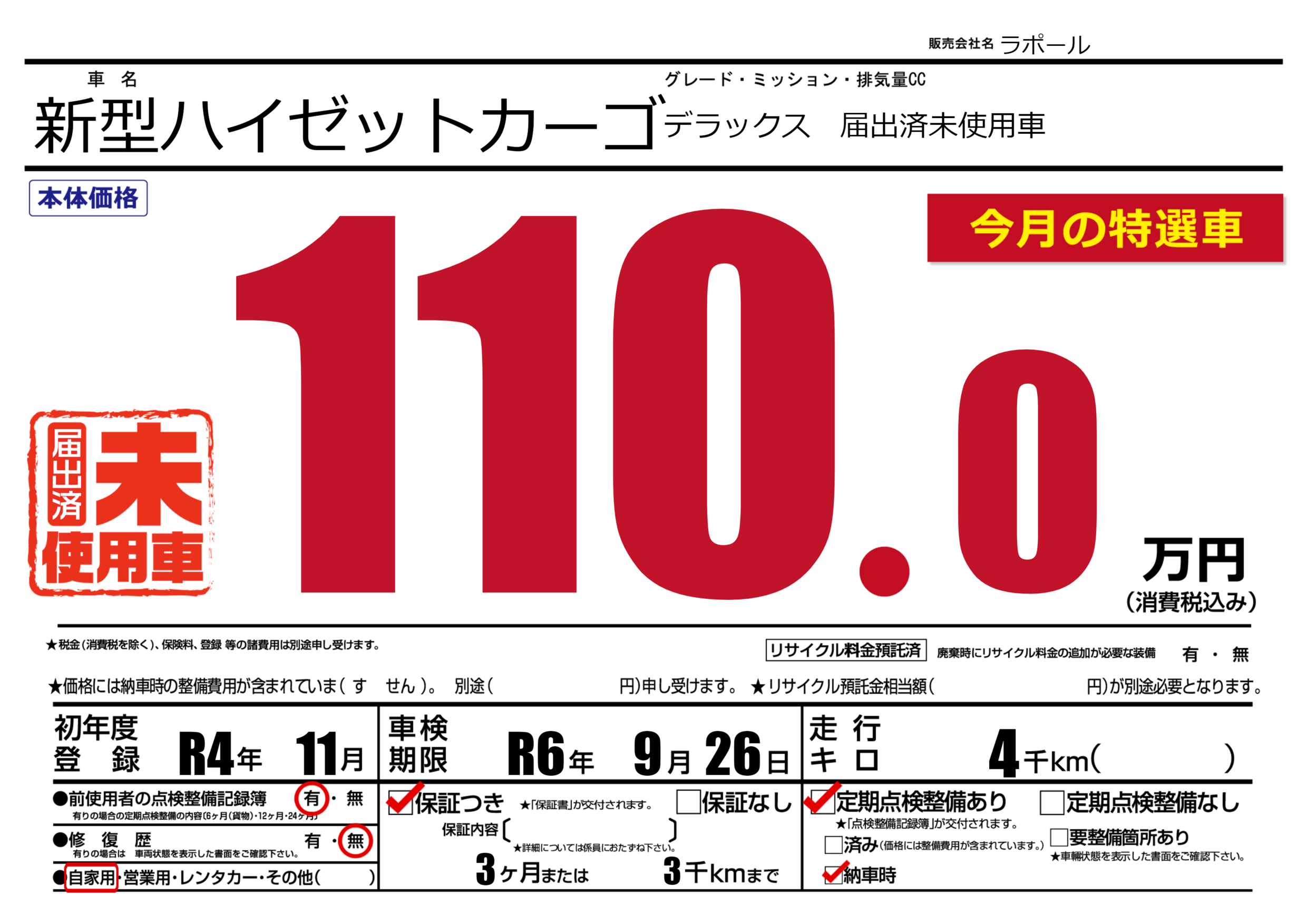 | 走行キロ | 0.4万km | 初年度登録 | R4年11月 |