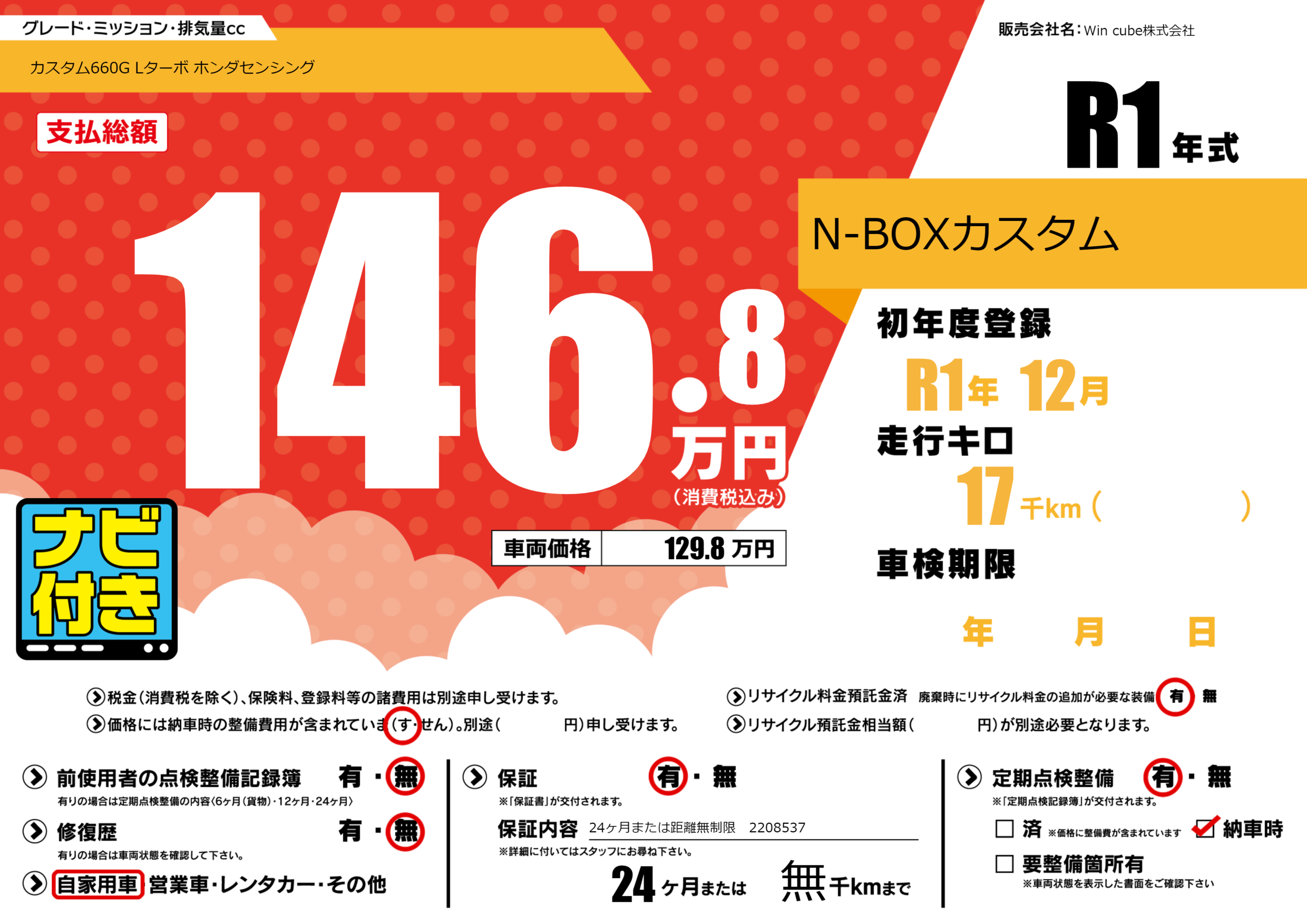| 定期点検整備 | 定期点検整備あり 納車時あり | ||