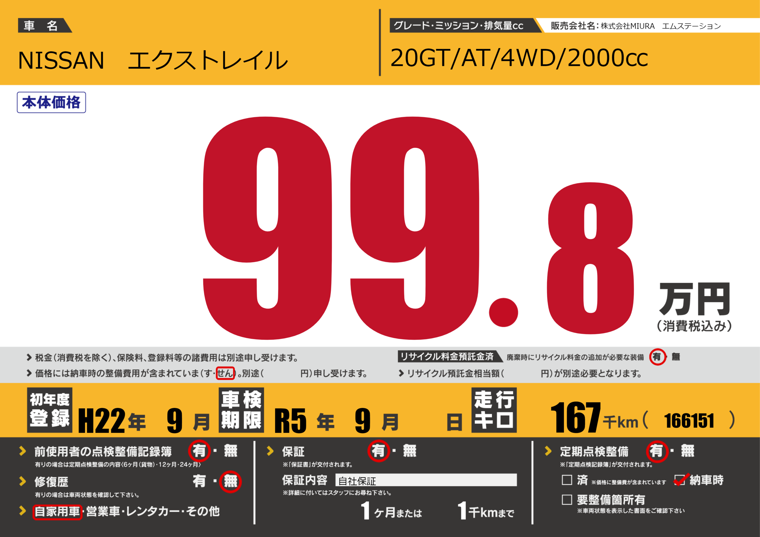 | 車検制限 | R5年 9月 - 日 | ||