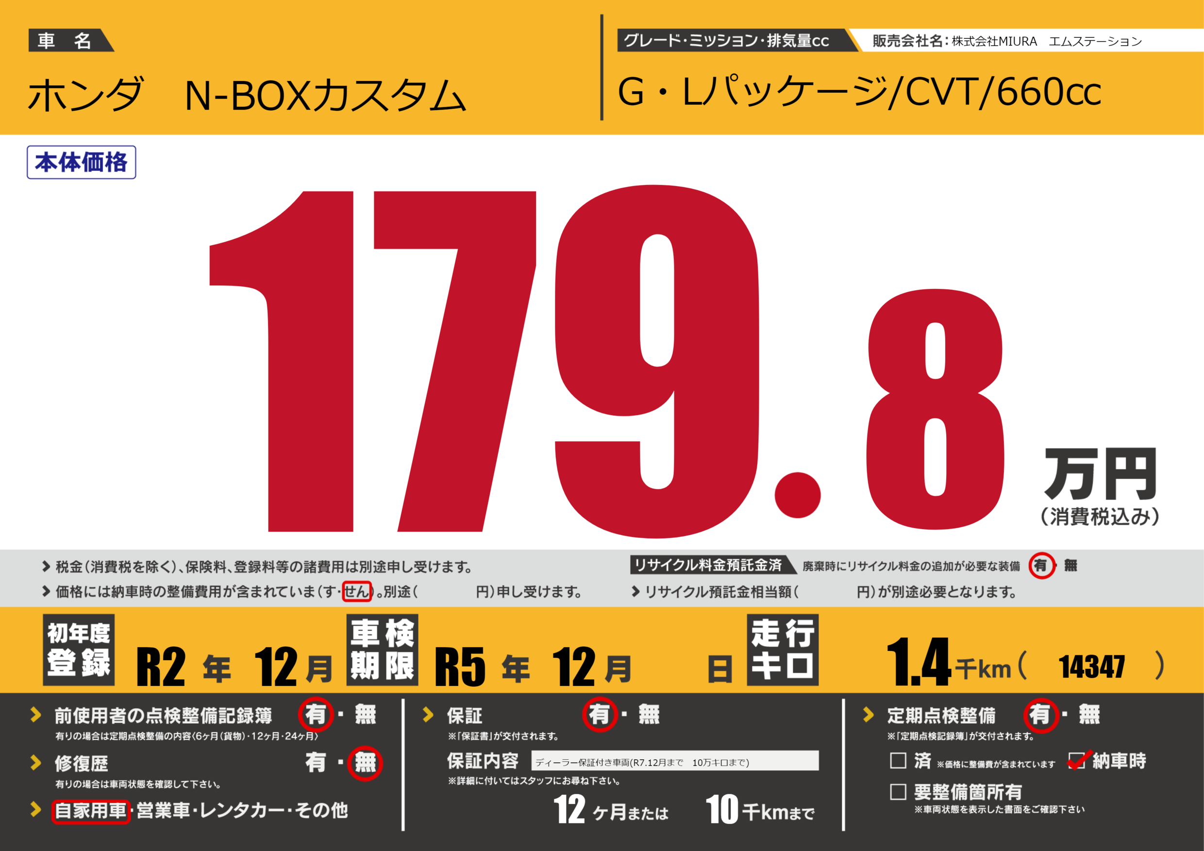 | 車検制限 | R5年 12月 - 日 | ||