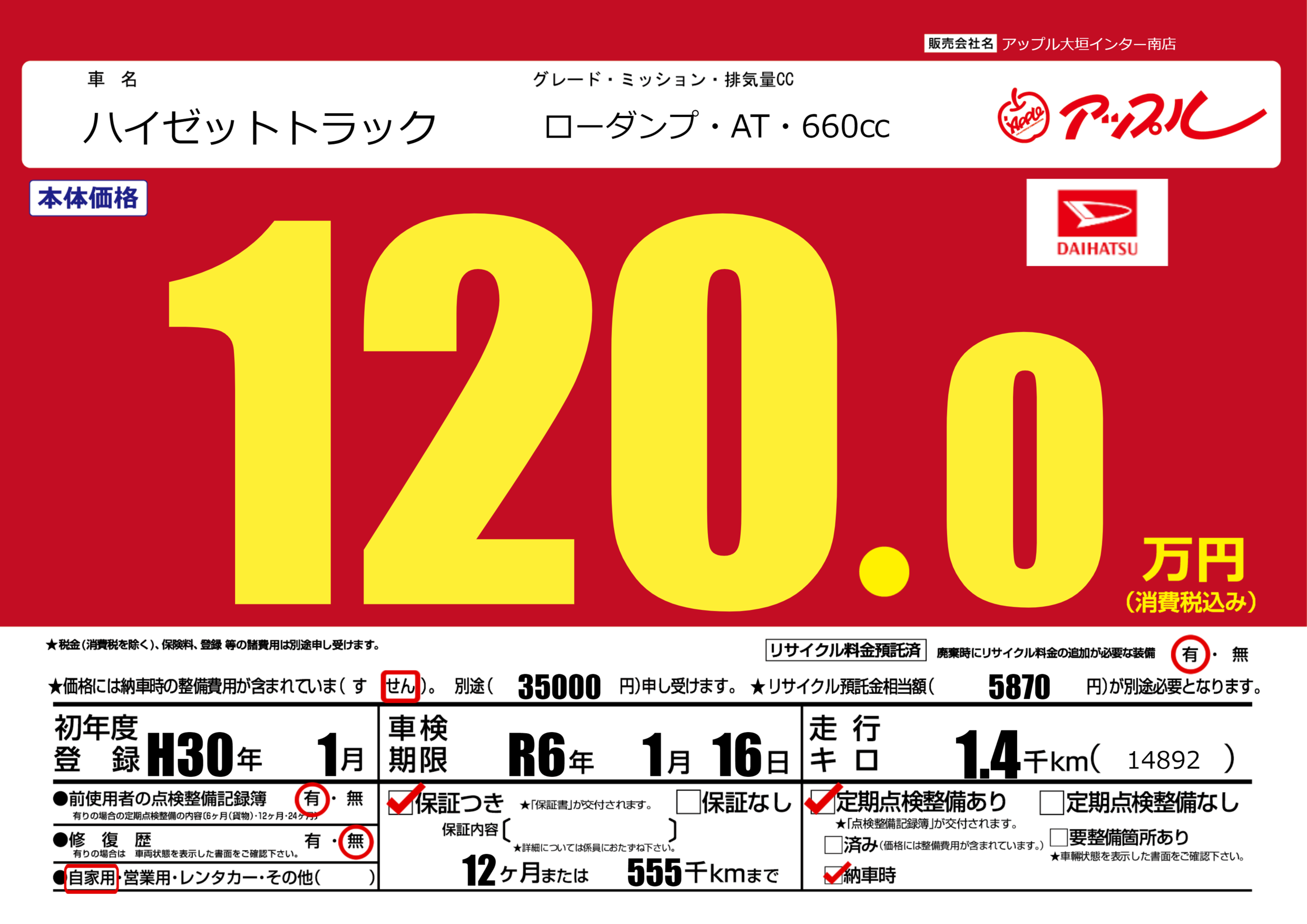 | 車名 | ハイゼットトラック | グレード ミッション 排気量 |