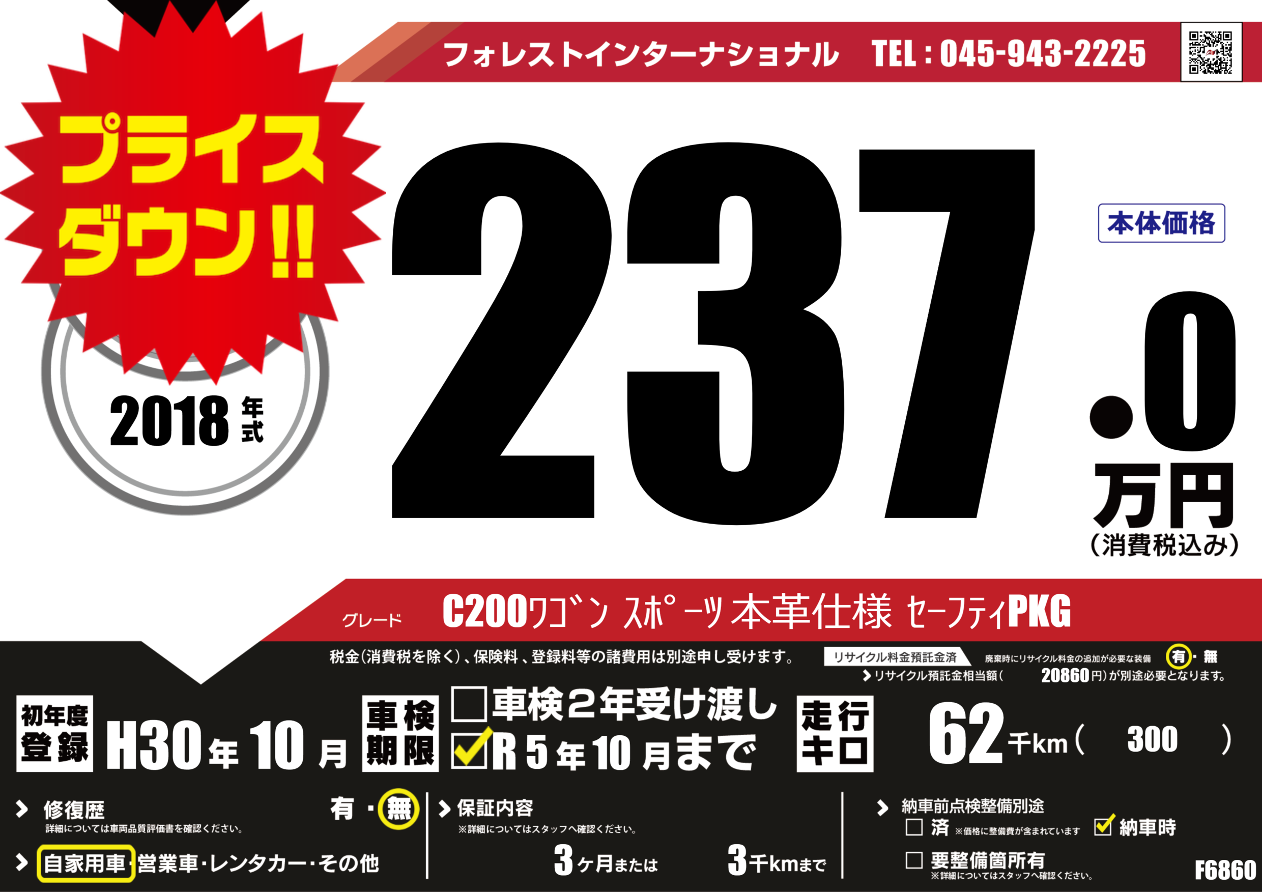 | 走行キロ | 6.2万km | 初年度登録 | H30年10月 |
