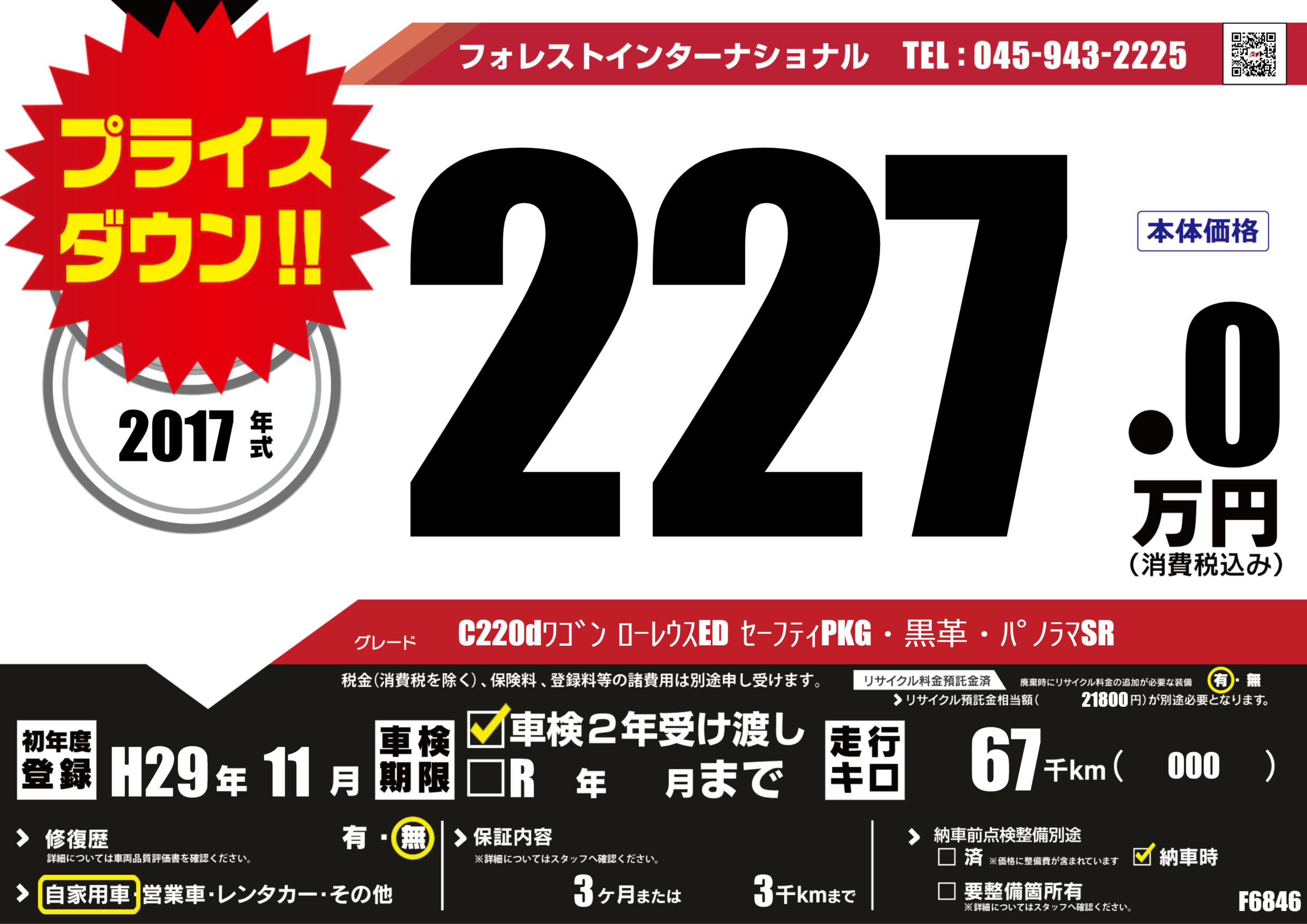 | 走行キロ | 6.7万km | 初年度登録 | H29年11月 |