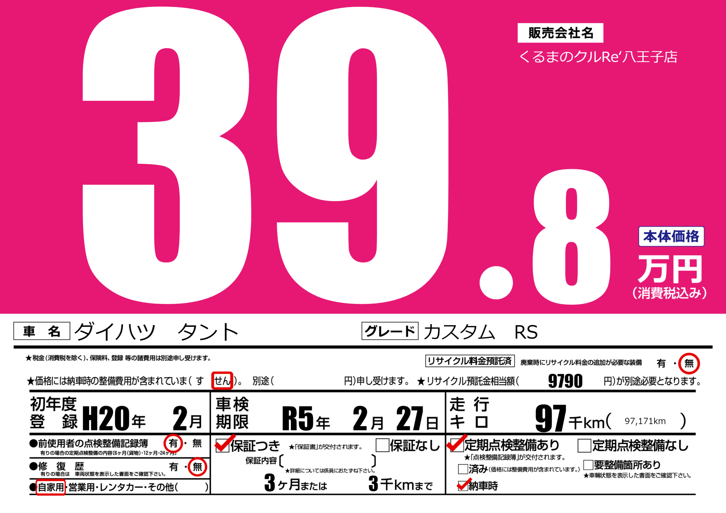 保証付き 保証内容(---) 3ヶ月または(3)千kmまで |