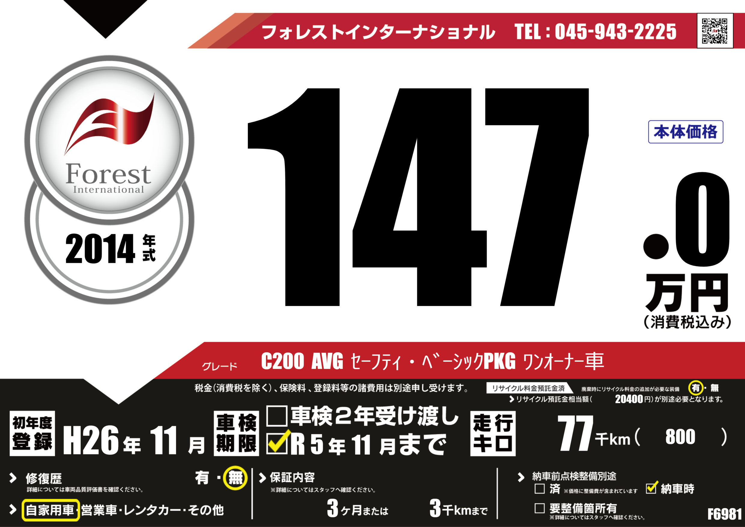 | 走行キロ | 7.7万km | 初年度登録 | H26年11月 |