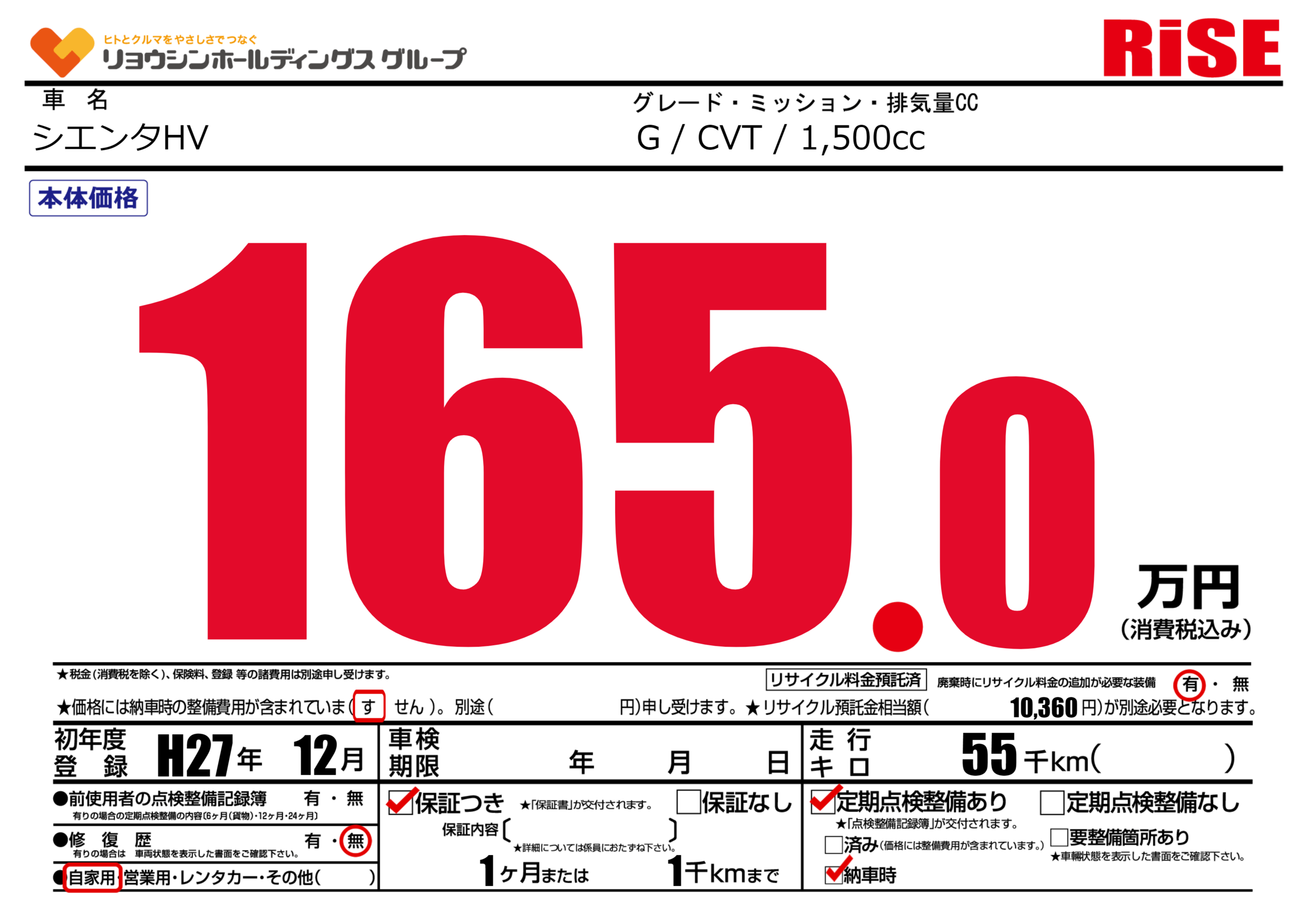 | 車名 | シエンタHV | グレード ミッション 排気量 |