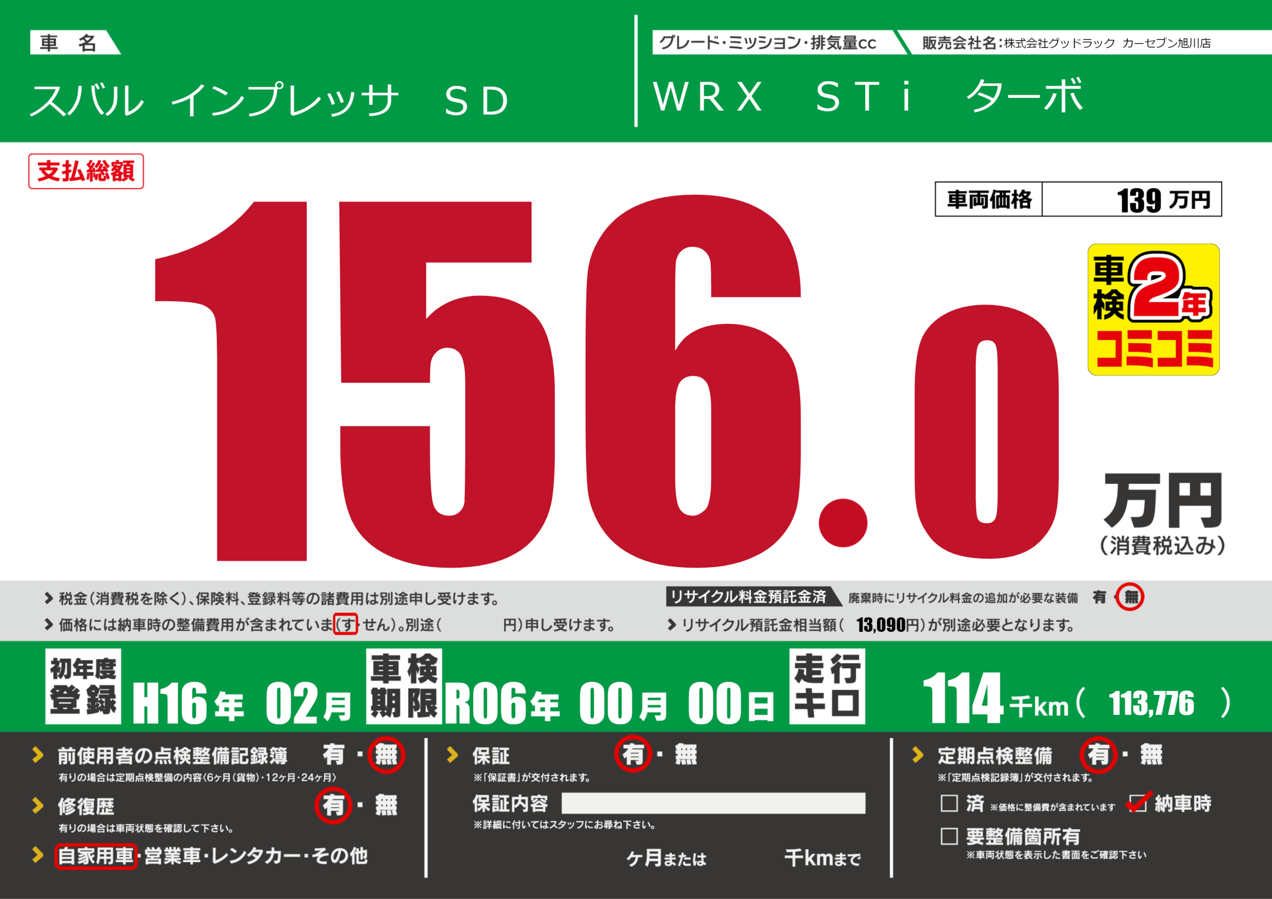 あり | 車検制限 | R06年00月00月 |