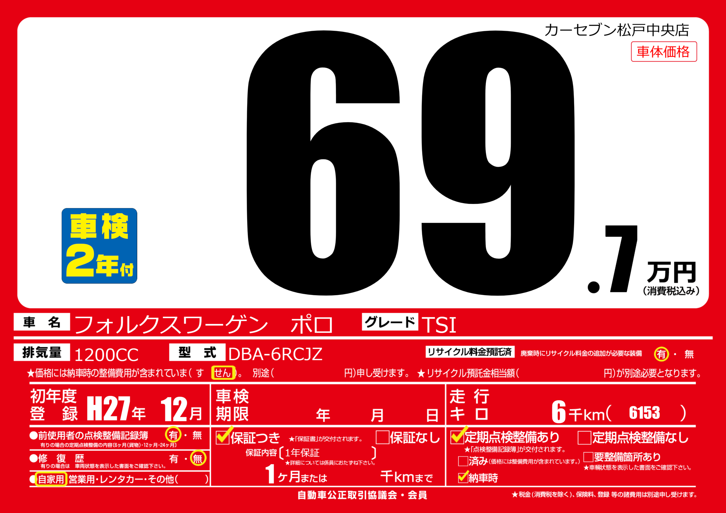 | 車名 | フォルクスワーゲン ポロ | グレード ミッション 排気量 |