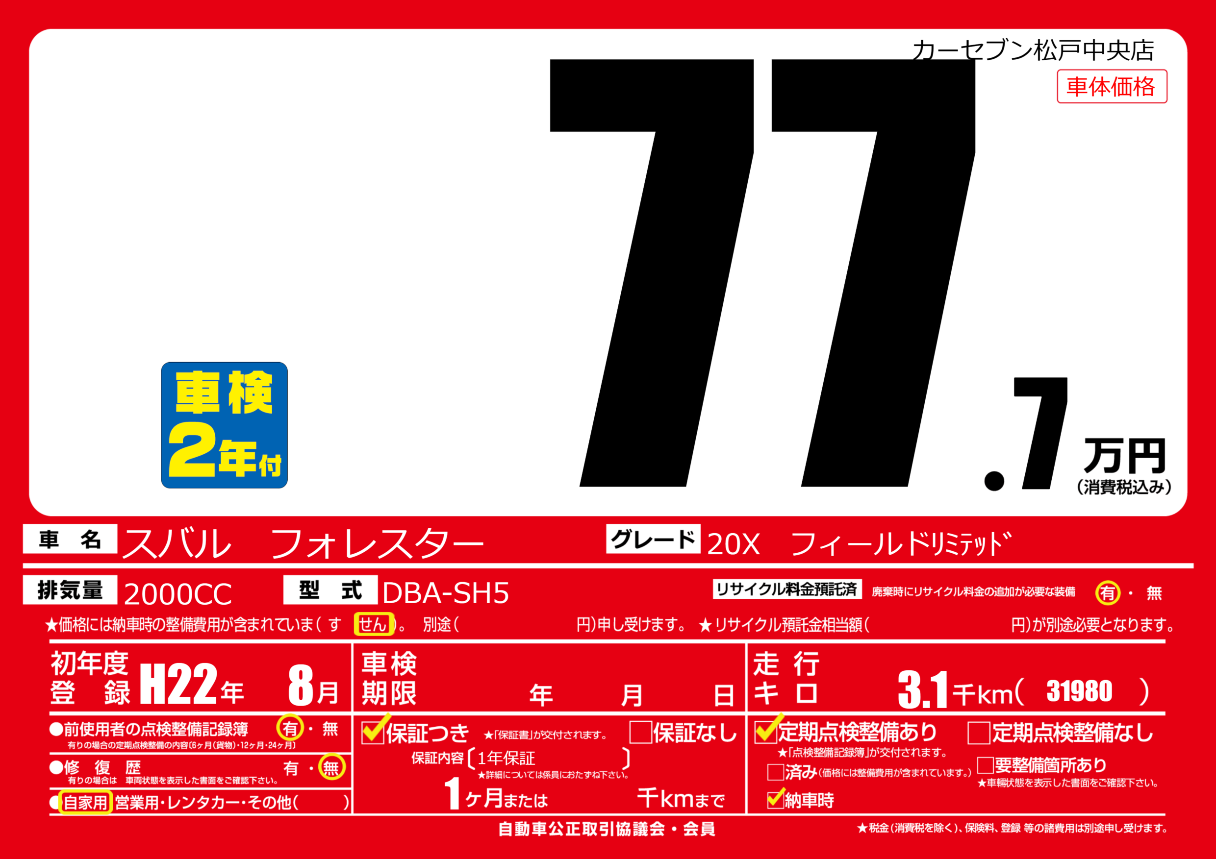 | 車名 | スバル フォレスター | グレード ミッション 排気量 |