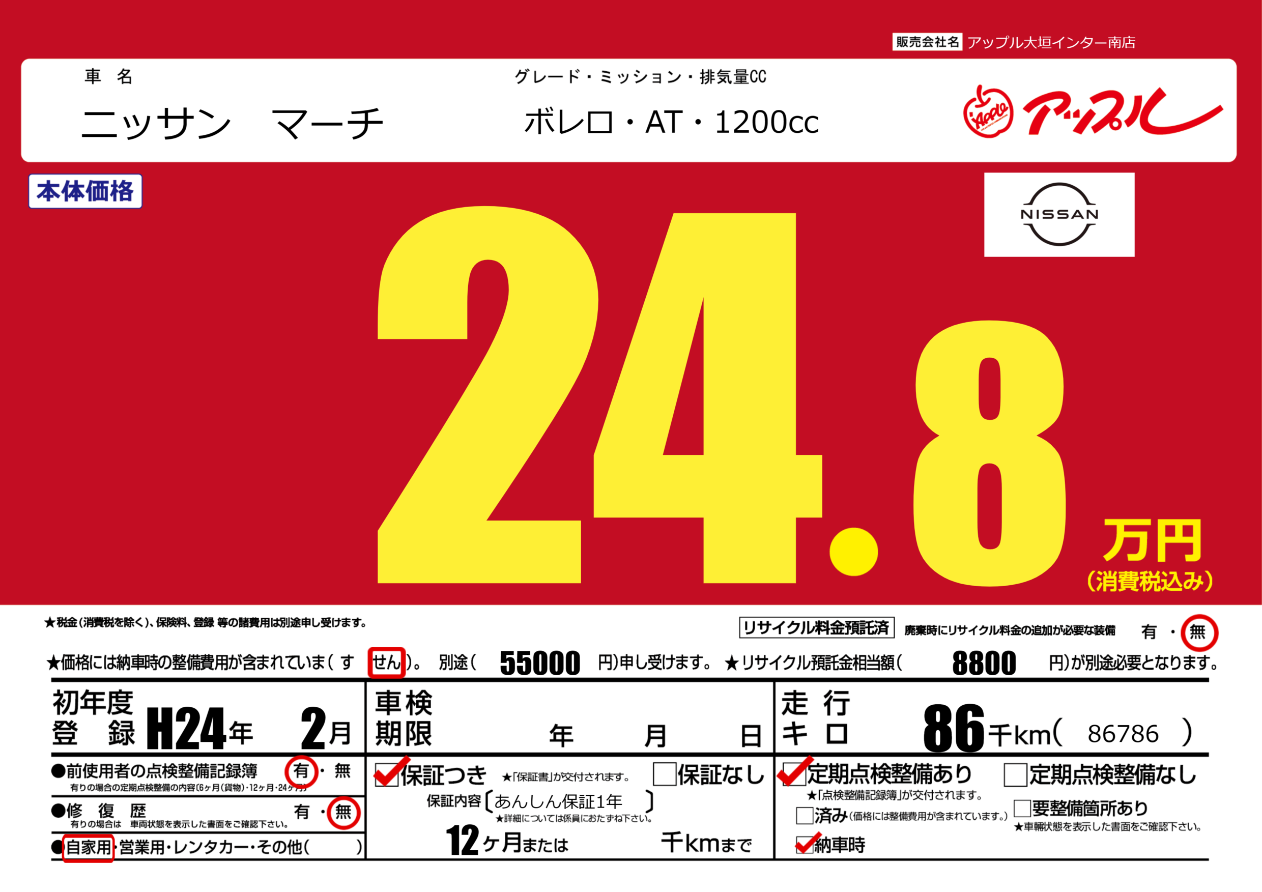 保証付き 保証内容(あんしん保証1年) 12ヶ月または()千kmまで |