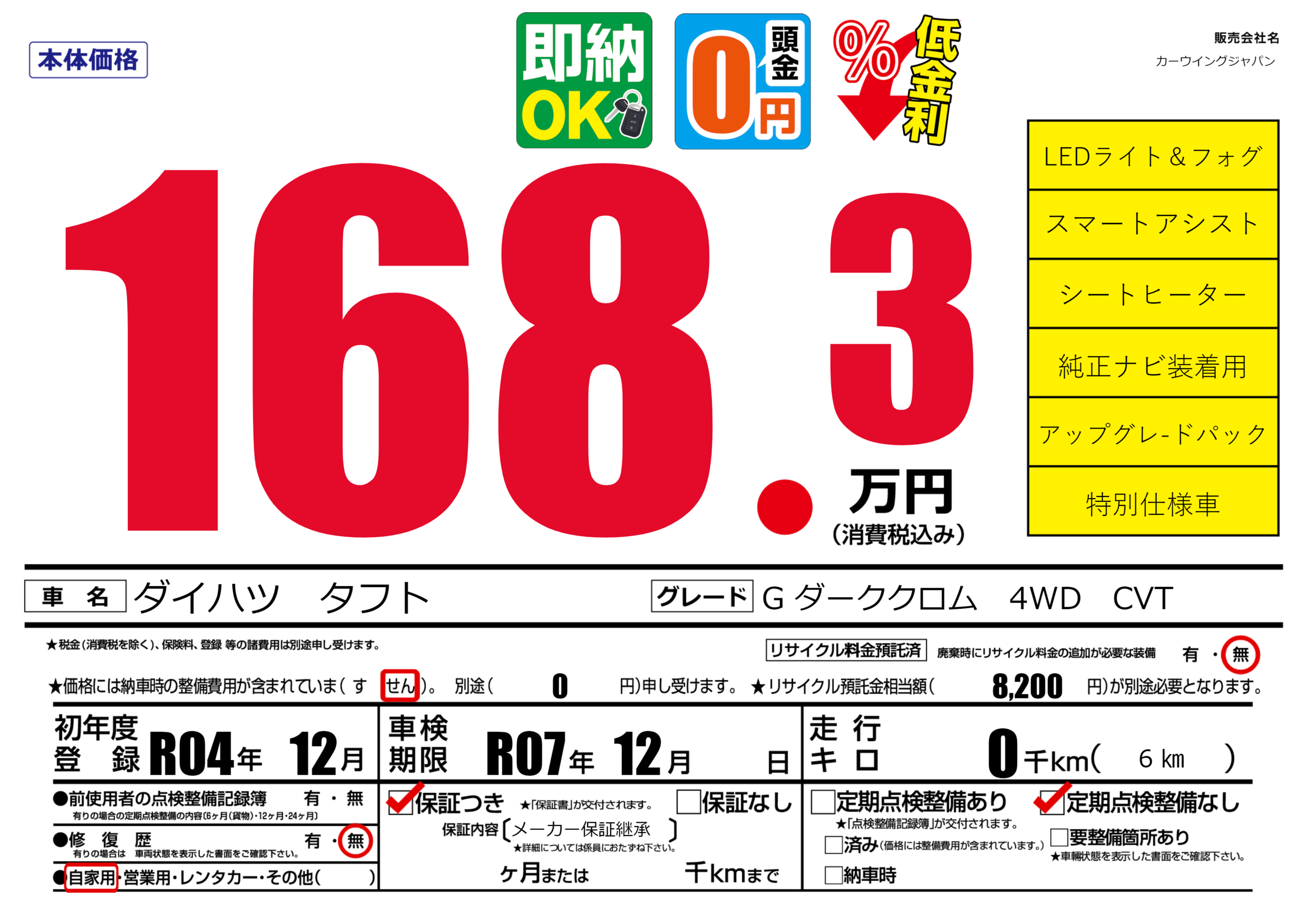 | 車名 | ダイハツ タフト | グレード ミッション 排気量 |
