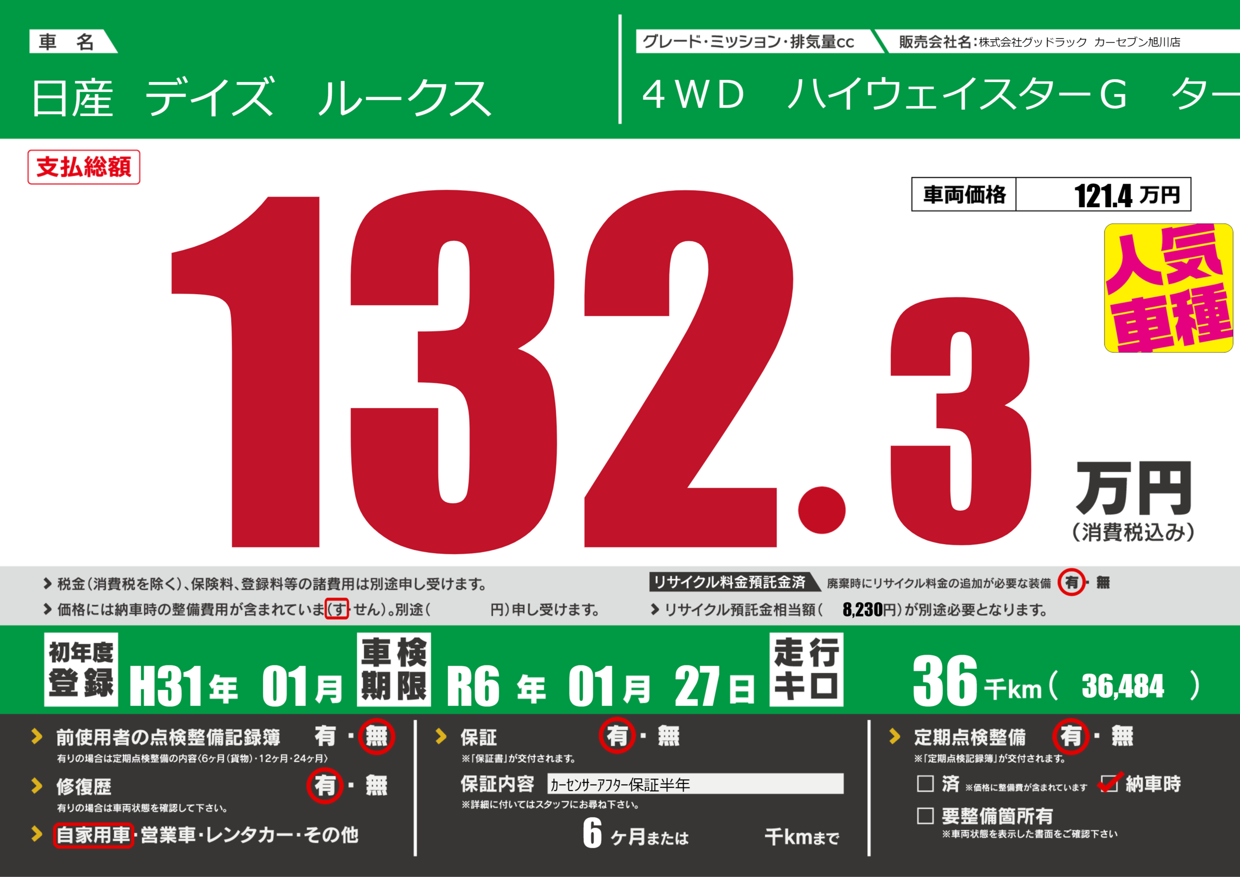 保証付き 保証内容(カーセンサーアフター保証半年) 6ヶ月または()千kmまで |