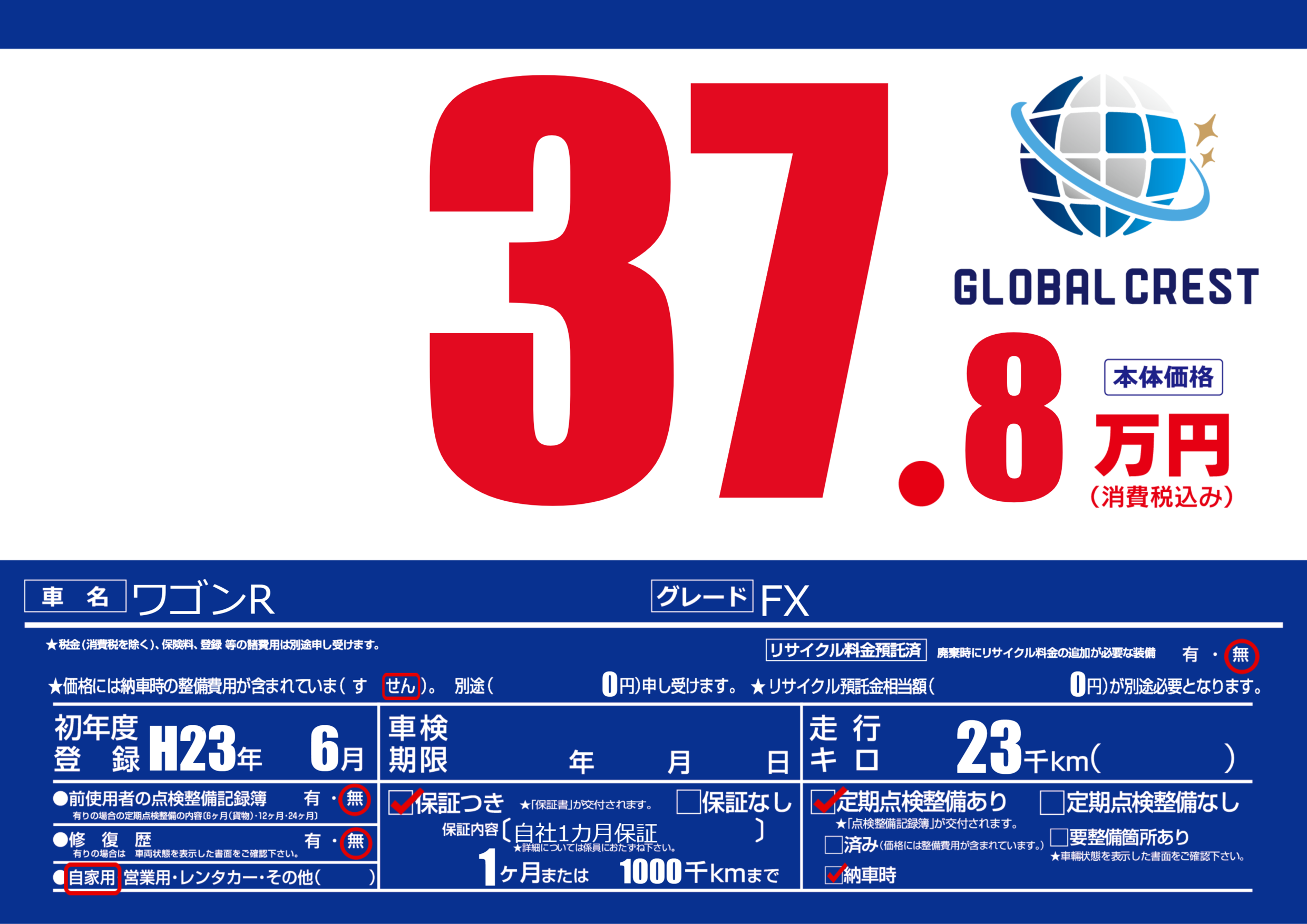 | 走行キロ | 2.3万km | 初年度登録 | H23年6月 |