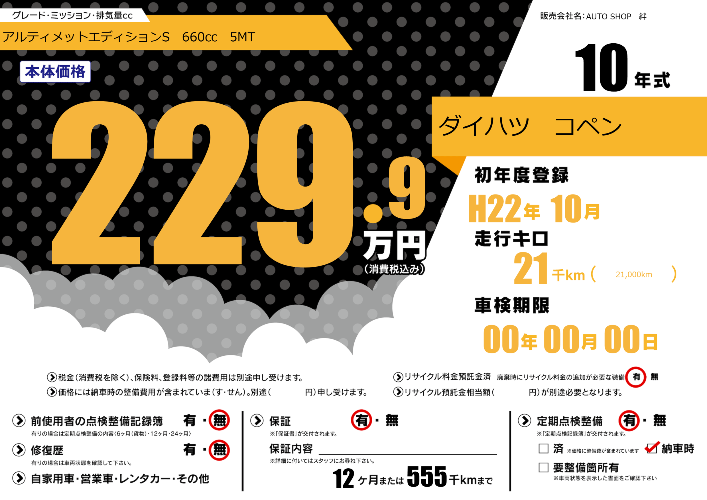| 車名 | ダイハツ コペン | グレード ミッション 排気量 |