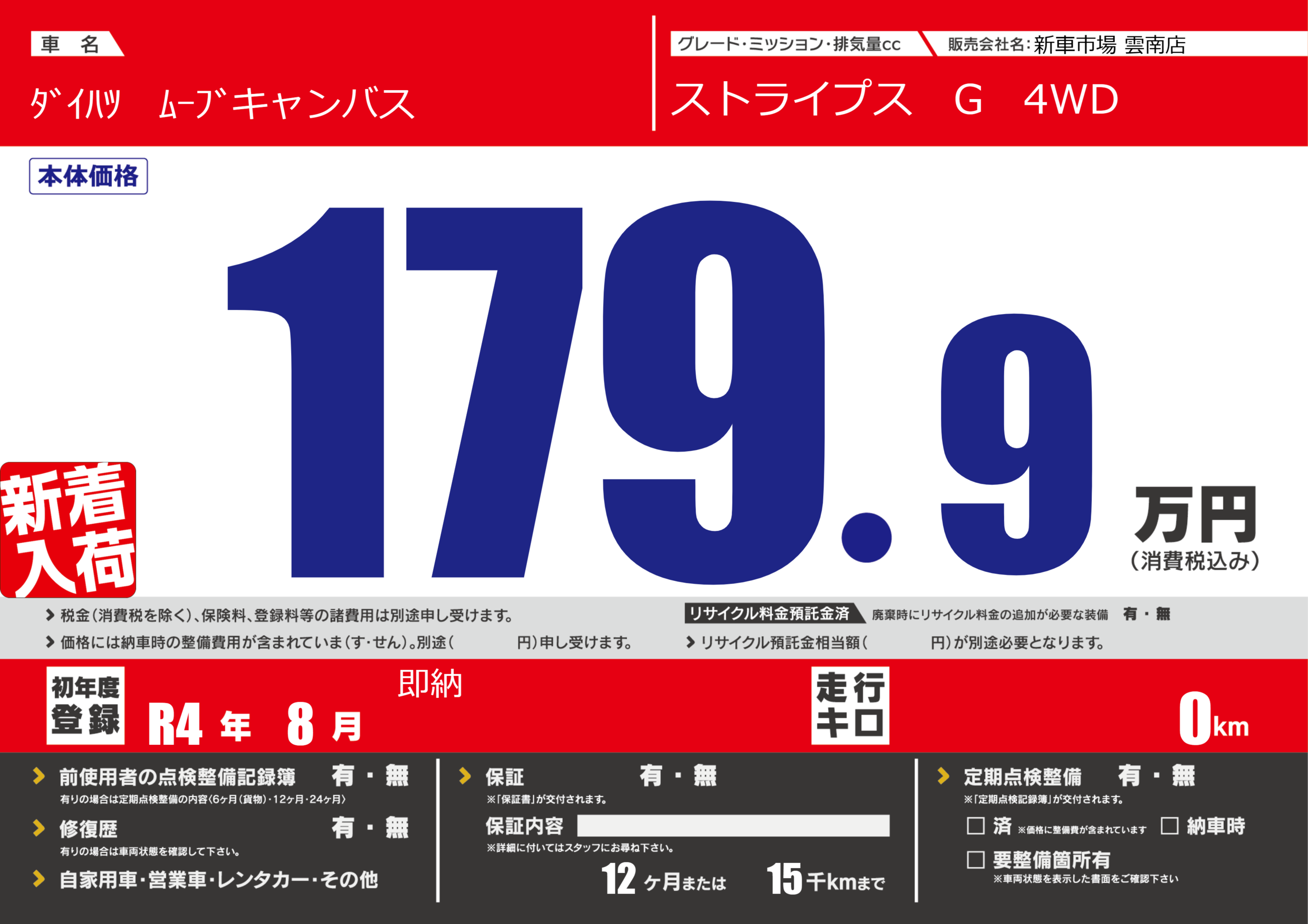 | 走行キロ | - | 初年度登録 | R4年8月 |