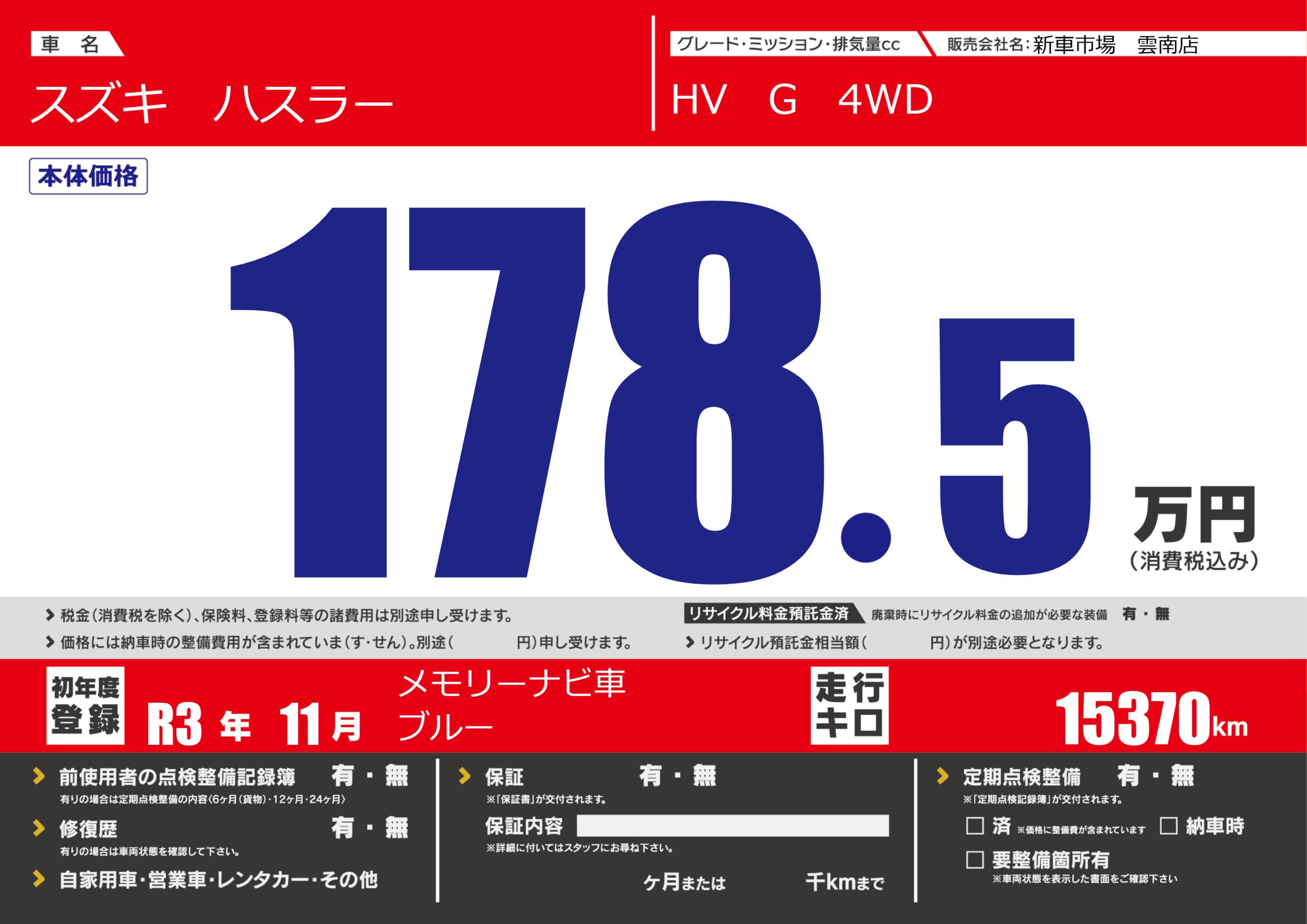 | 車名 | スズキ ハスラー | グレード ミッション 排気量 |