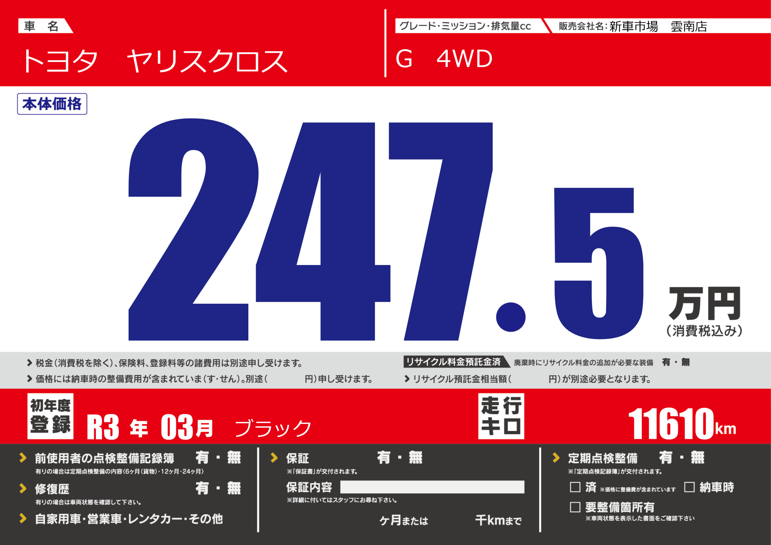 | 車名 | トヨタ ヤリスクロス | グレード ミッション 排気量 |