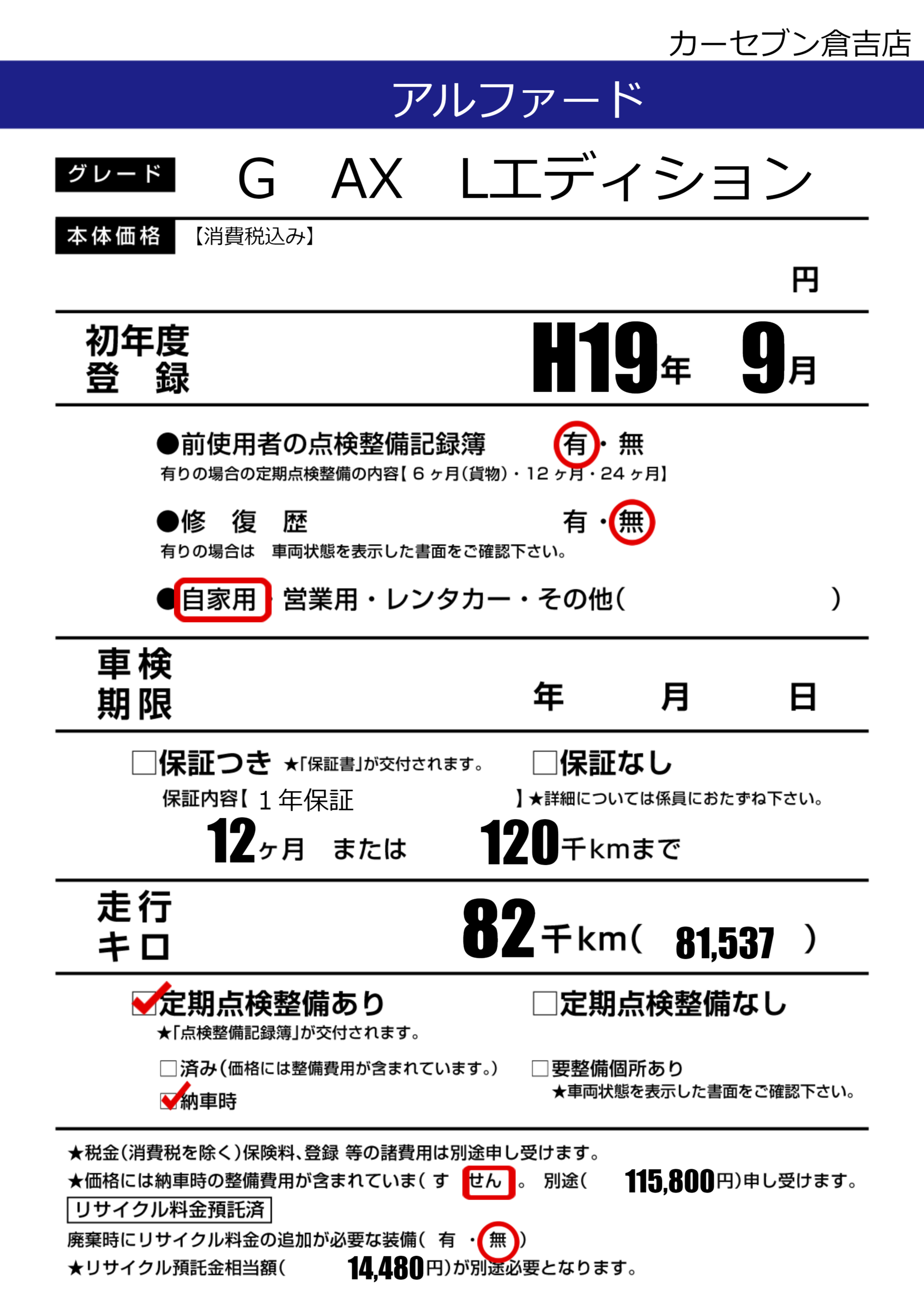 | 車名 | アルファード | グレード ミッション 排気量 |