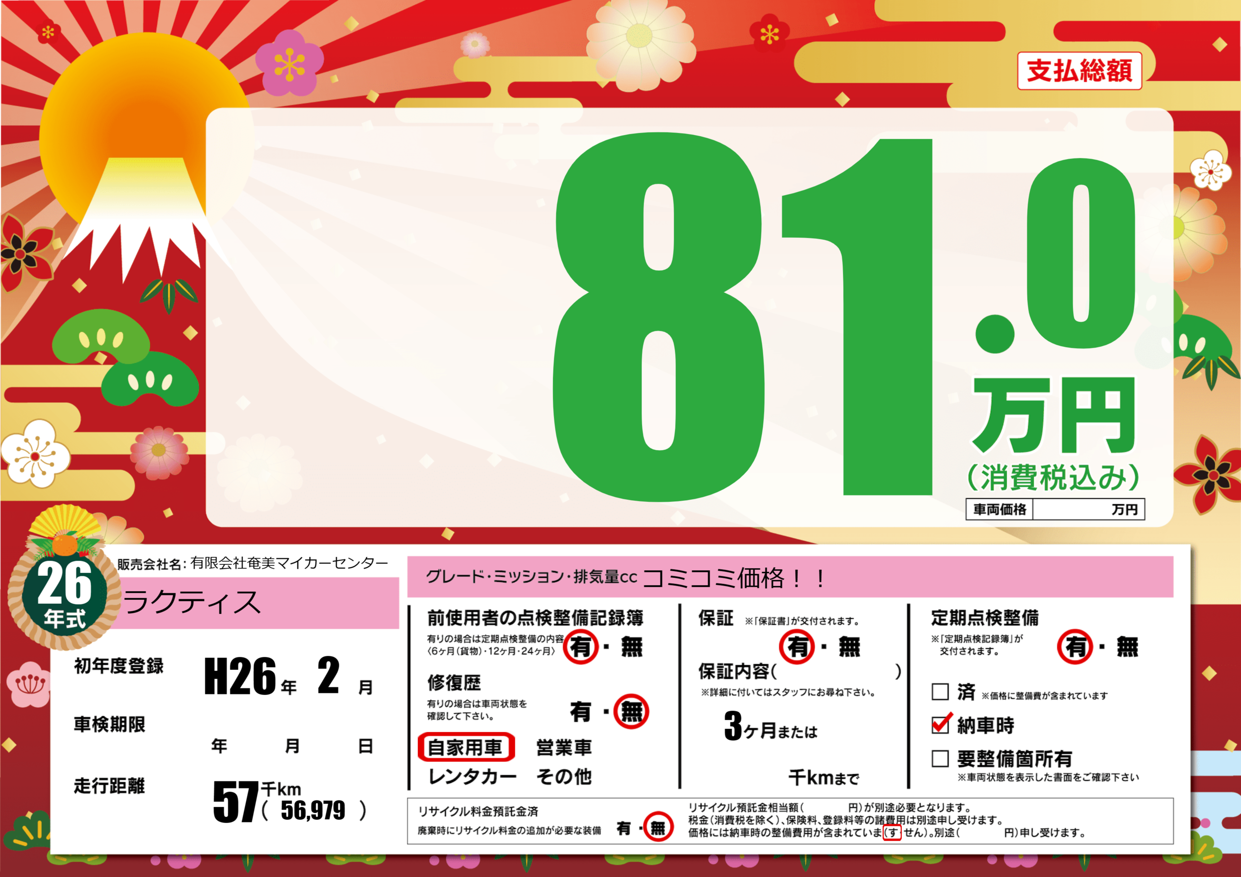 | 車名 | ラクティス | グレード ミッション 排気量 |