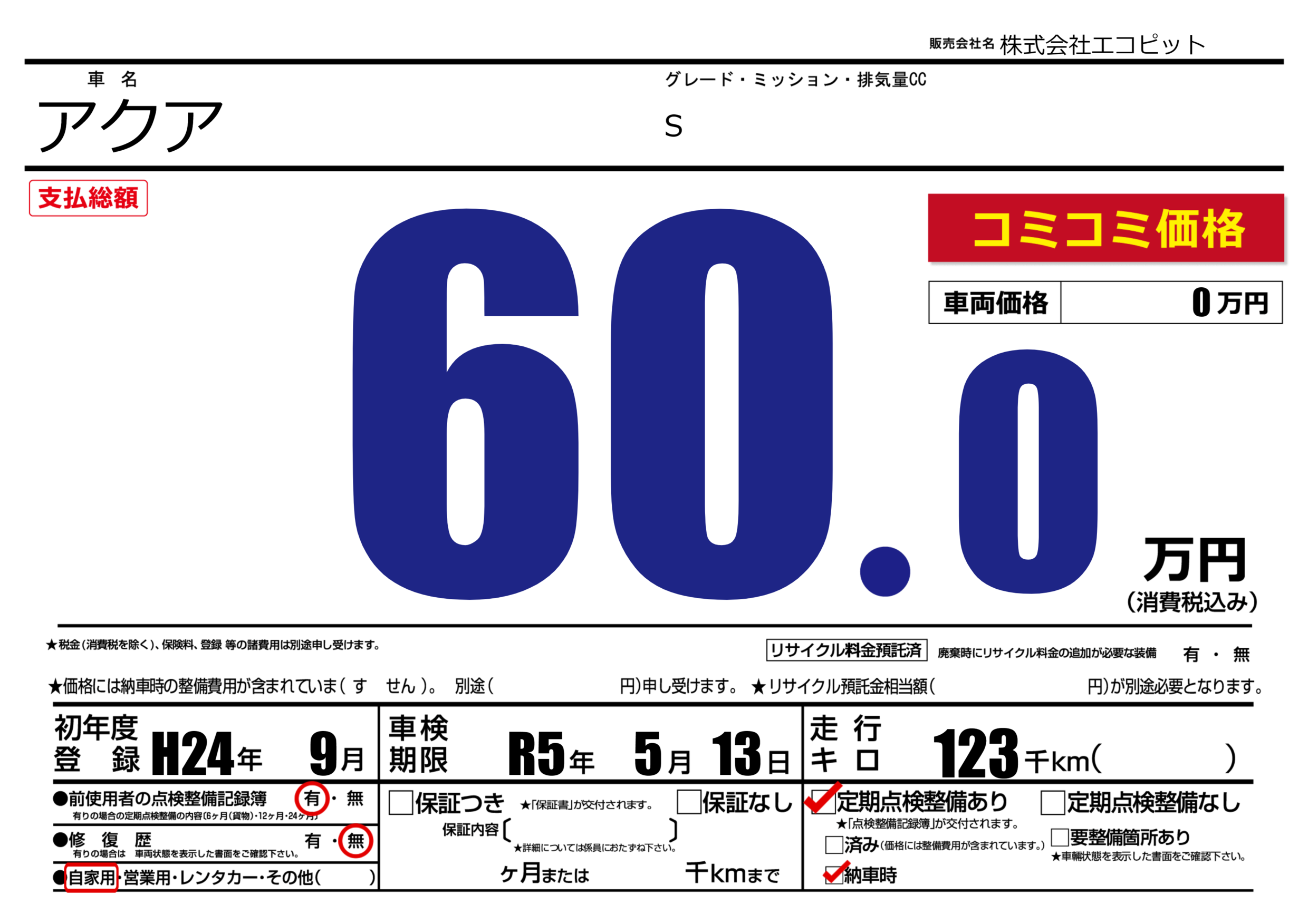 | 定期点検整備 | 定期点検整備あり 納車時あり | ||