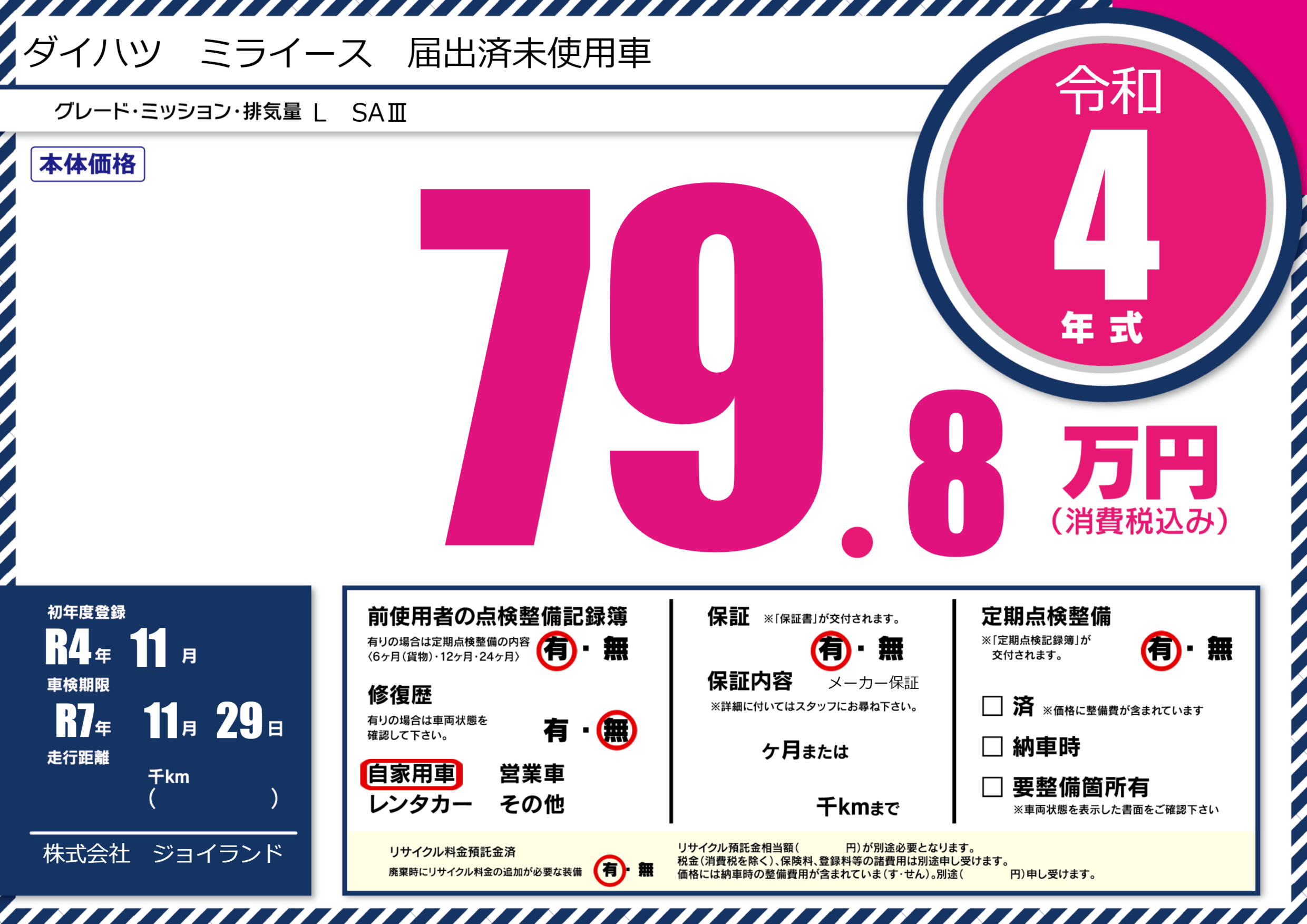 保証付き 保証内容( メーカー保証) ---ヶ月または()千kmまで |