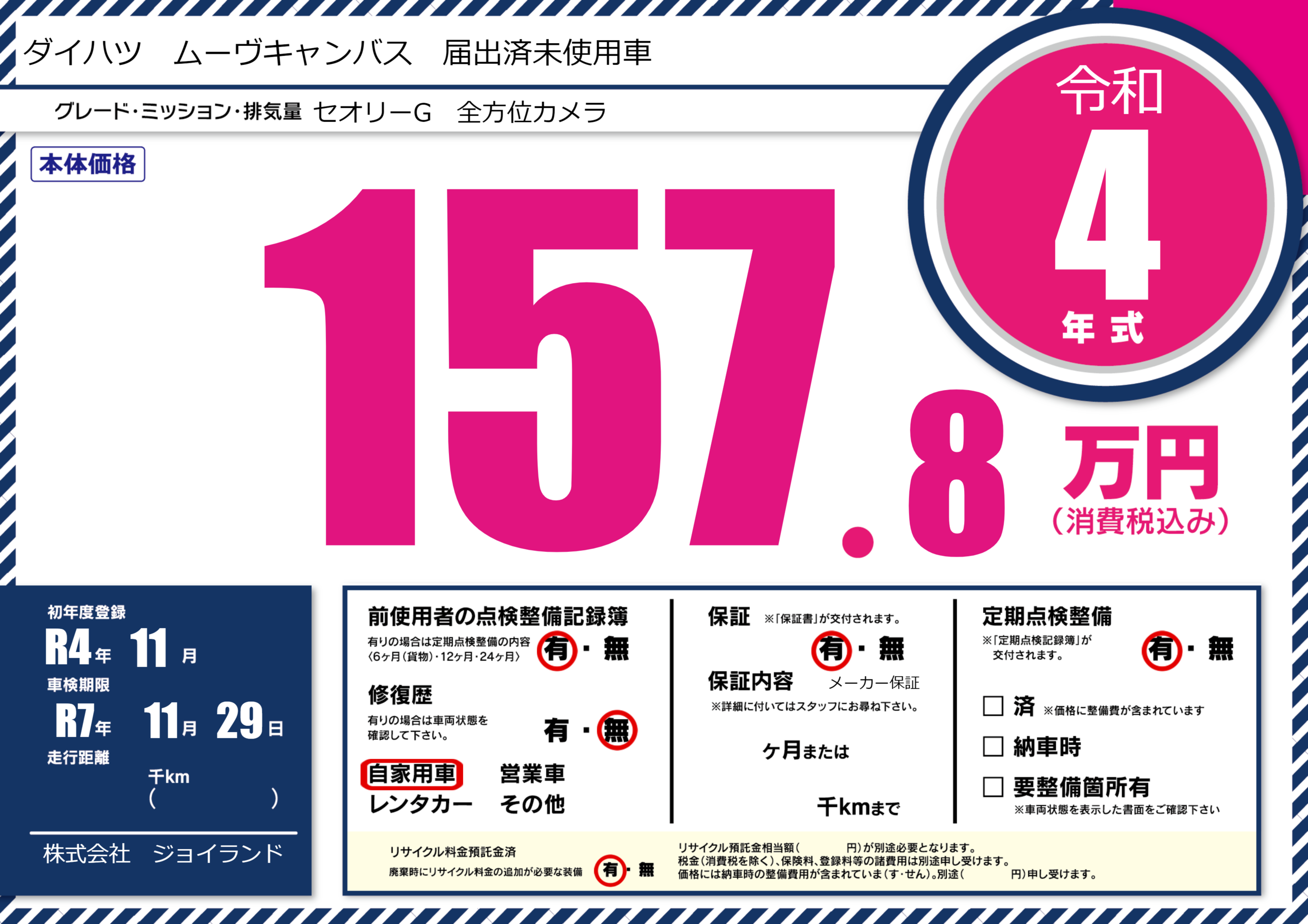 | 走行キロ | - | 初年度登録 | R4年11月 |