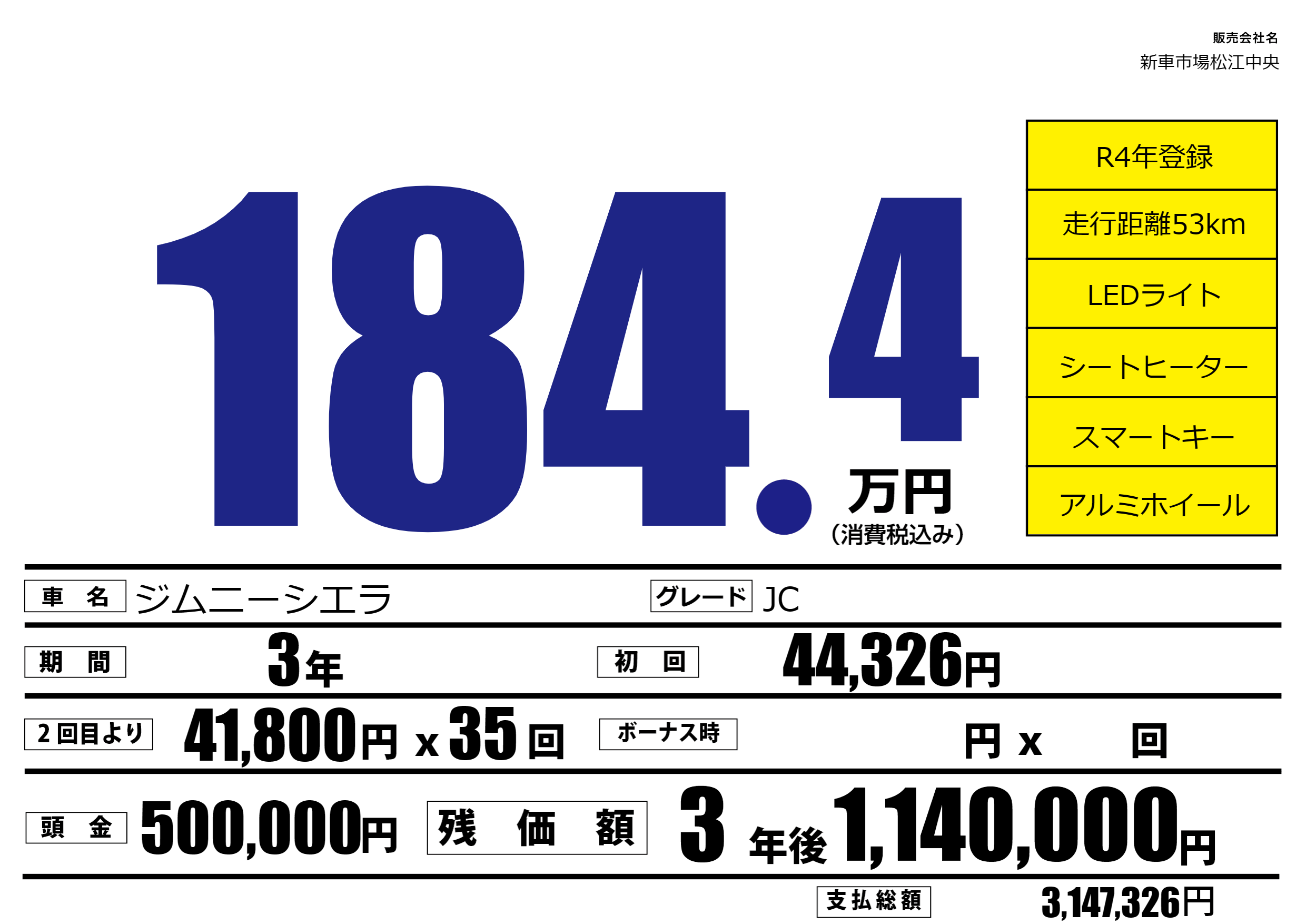 | 車名 | ジムニーシエラ | グレード ミッション 排気量 |