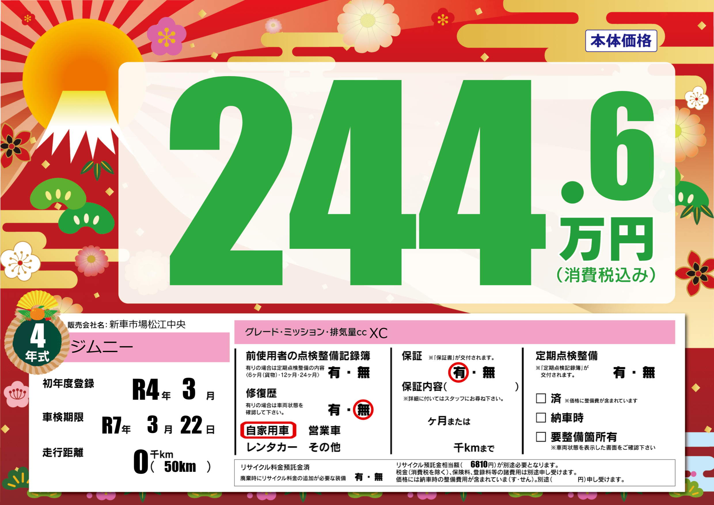 | 車名 | ジムニー | グレード ミッション 排気量 |