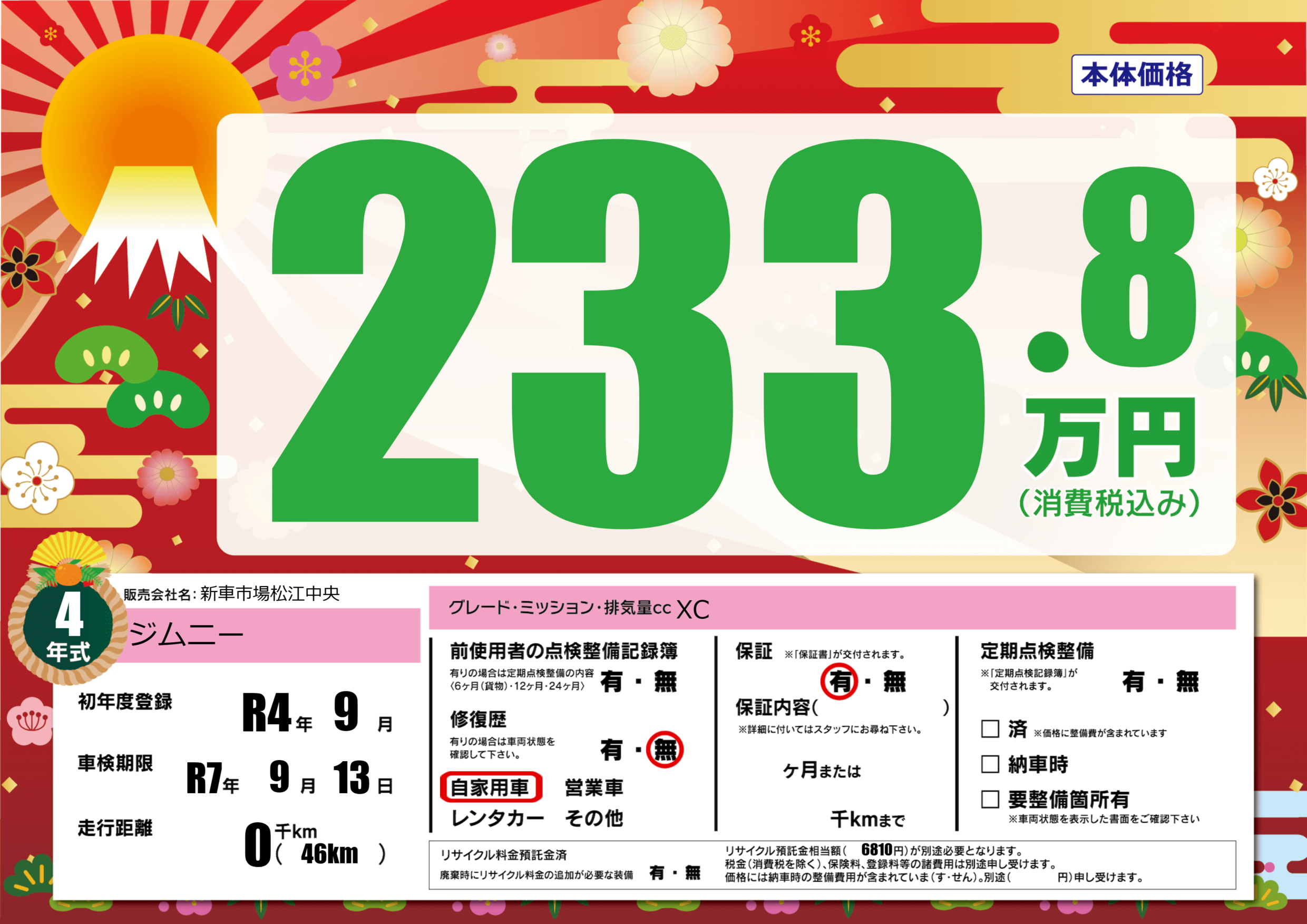 | 車名 | ジムニー | グレード ミッション 排気量 |