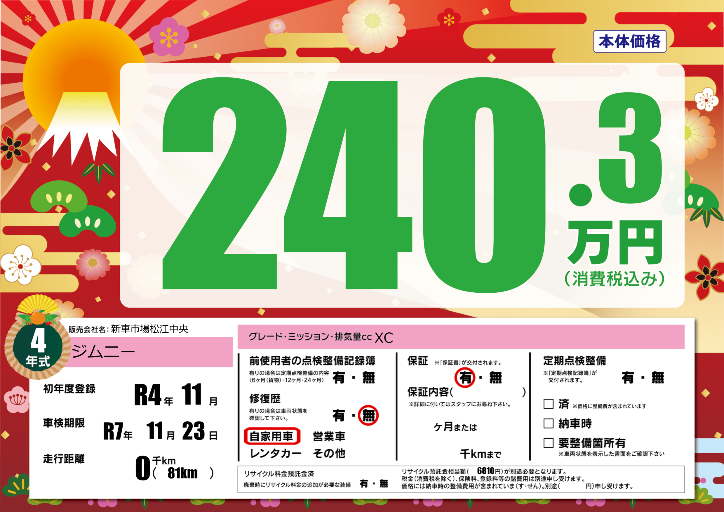 | 車名 | ジムニー | グレード ミッション 排気量 |