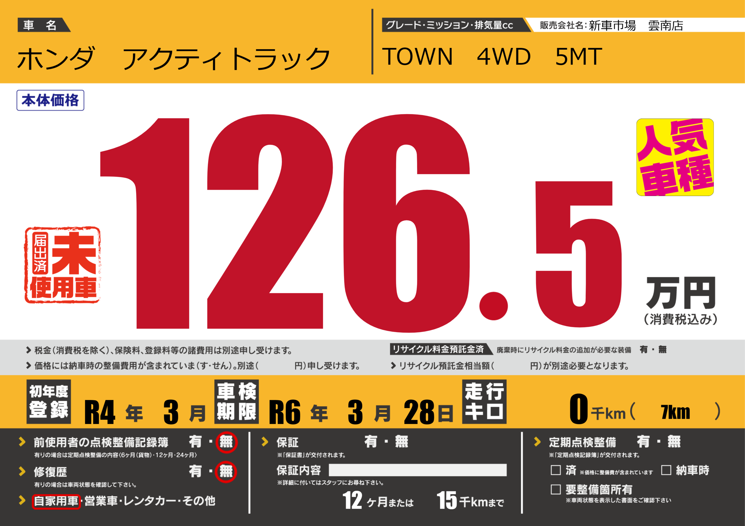 | 車名 | ホンダ アクティトラック | グレード ミッション 排気量 |