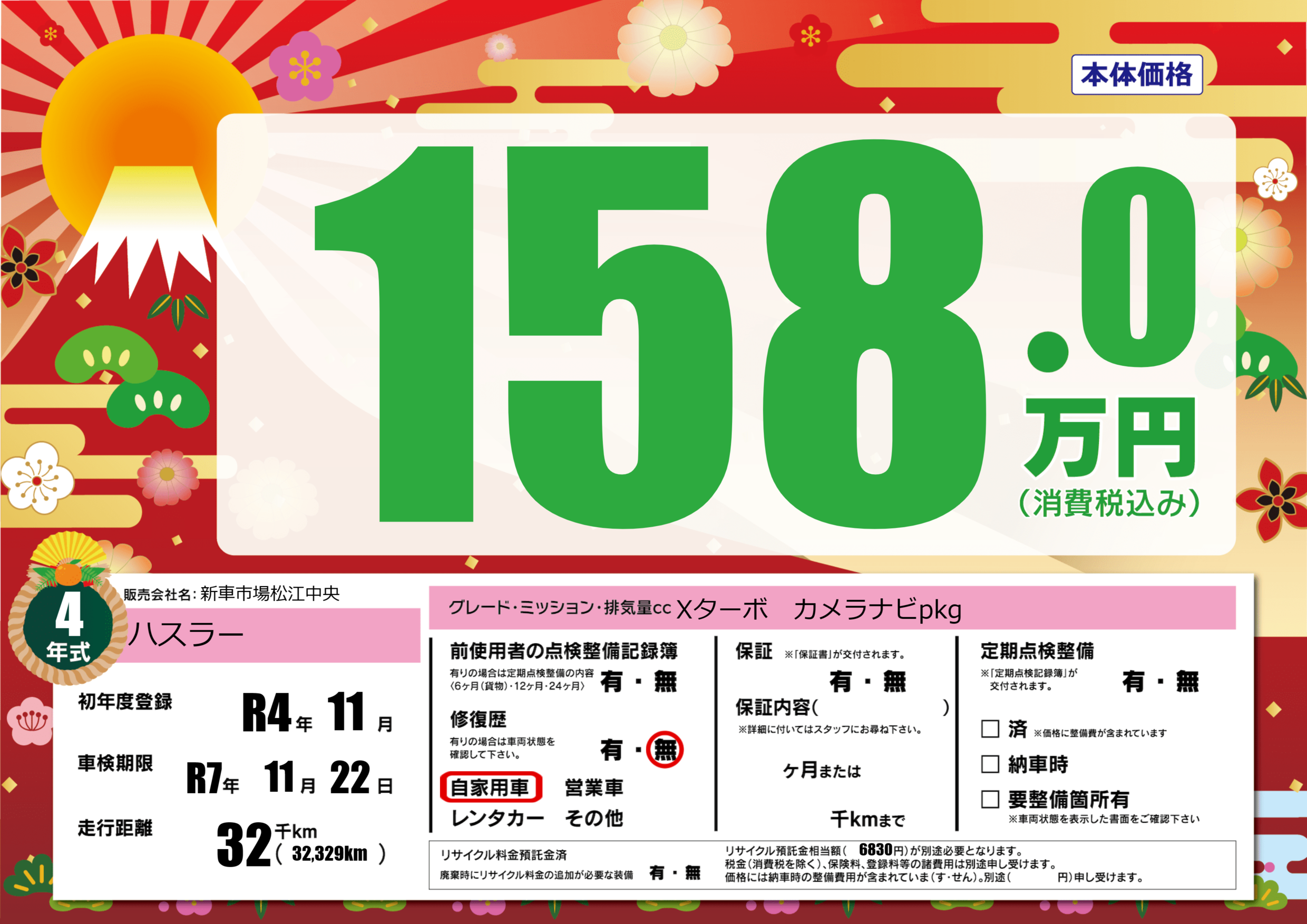 | 走行キロ | 3.2万km | 初年度登録 | R4年11月 |