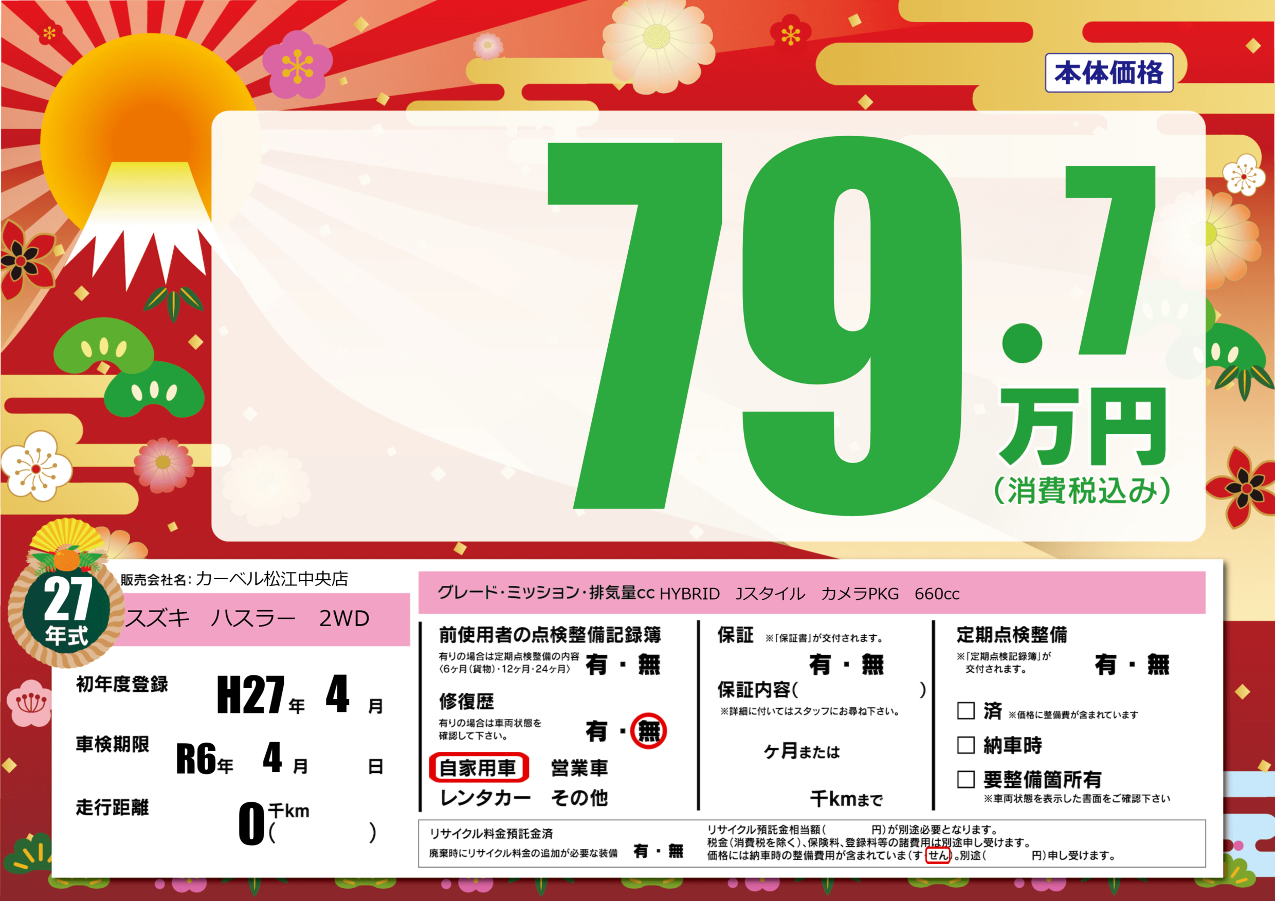 | 車名 | スズキ ハスラー 2WD | グレード ミッション 排気量 |