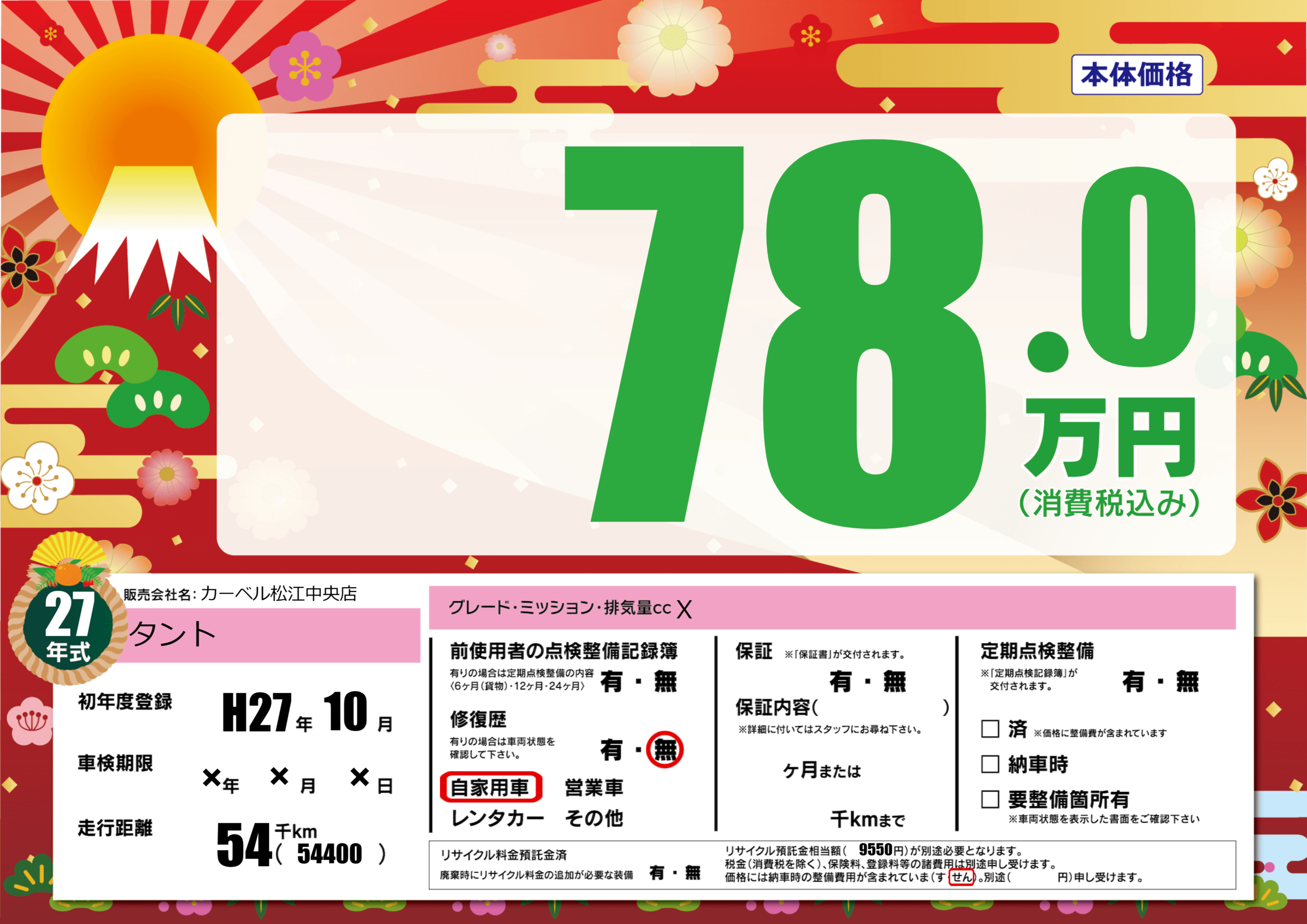 | 走行キロ | 5.4万km | 初年度登録 | H27年10月 |